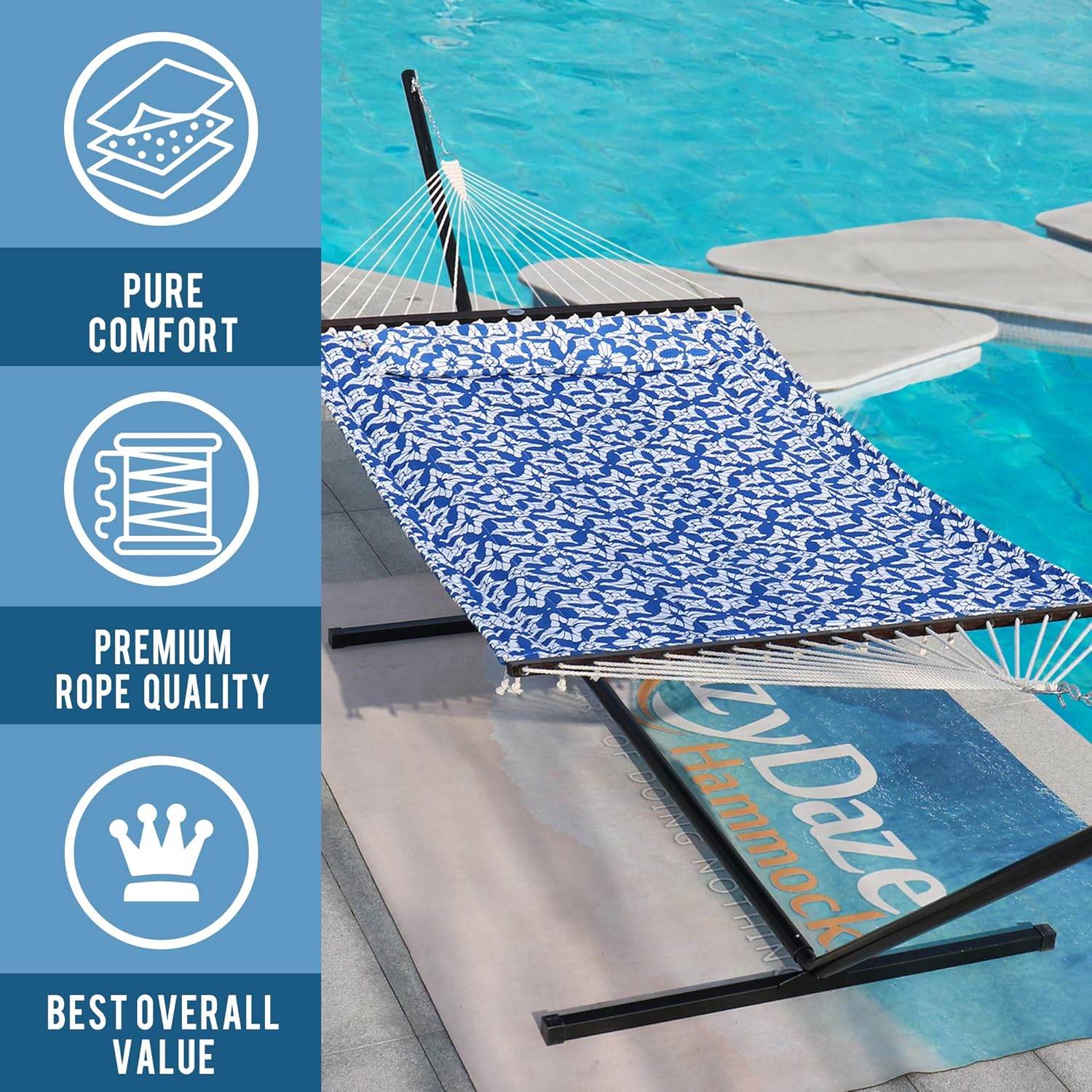 Lazy Daze Quilted Fabric Hammock with Spreader Bar, 2-Person Double Hammock for Outside Patio Poolside Backyard Beach, 450 lbs Capacity, QF48