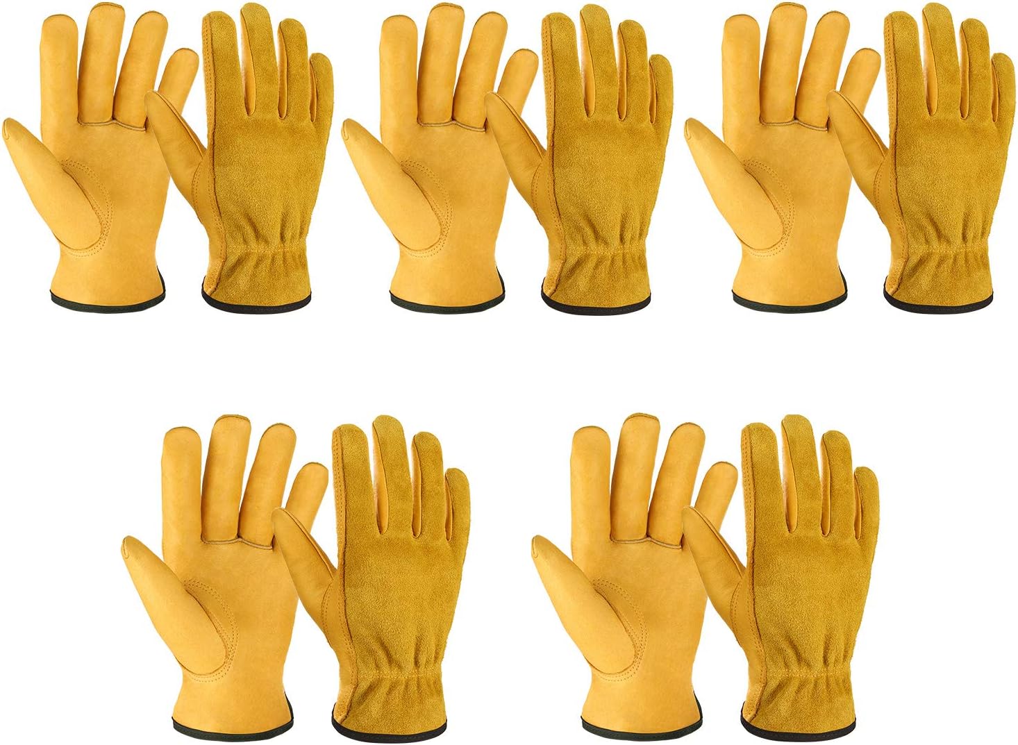 OZERO 5Pair Leather Work Gloves Cowhide Garden Glove for Wood Cutting/Yard Gold,Large