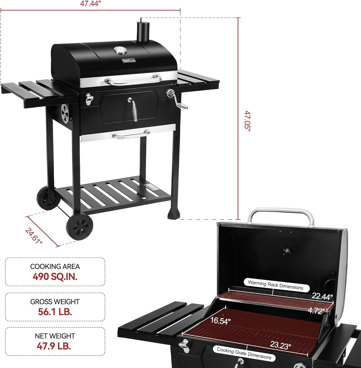- Convenient Cleaning & Storage: Cleanup is a breeze with a large, movable ash tray for easy dumping. Two collapsible side tables offer prep space and fold to save room; a bottom shelf provides extra storage for charcoal and tools