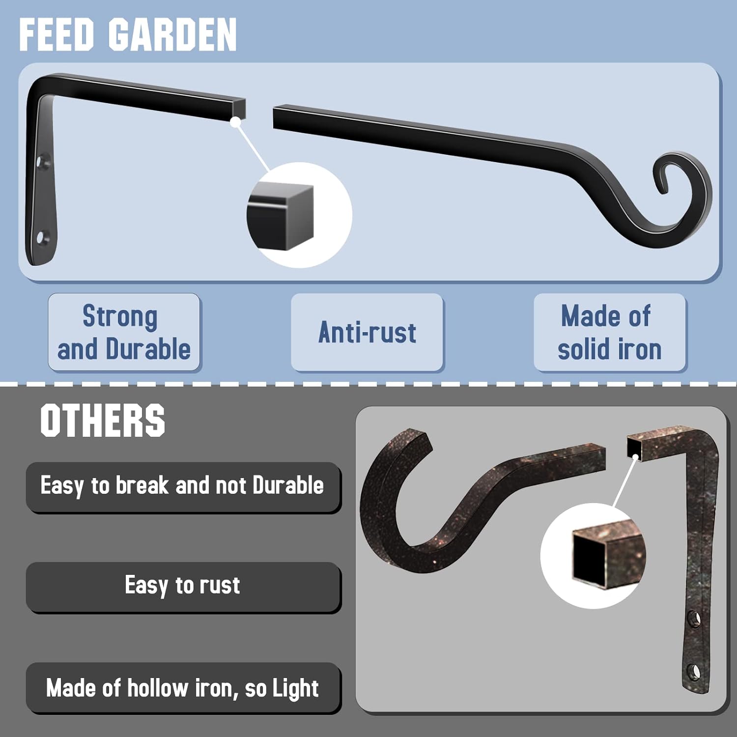 FEED GARDEN 15 Inch 2 Pack Hand-Forged Hanging Plant Bracket Heavy Duty Metal Plant Hangers for Outdoor Hanging Bird Feeders Lanterns Wind Chimes Black