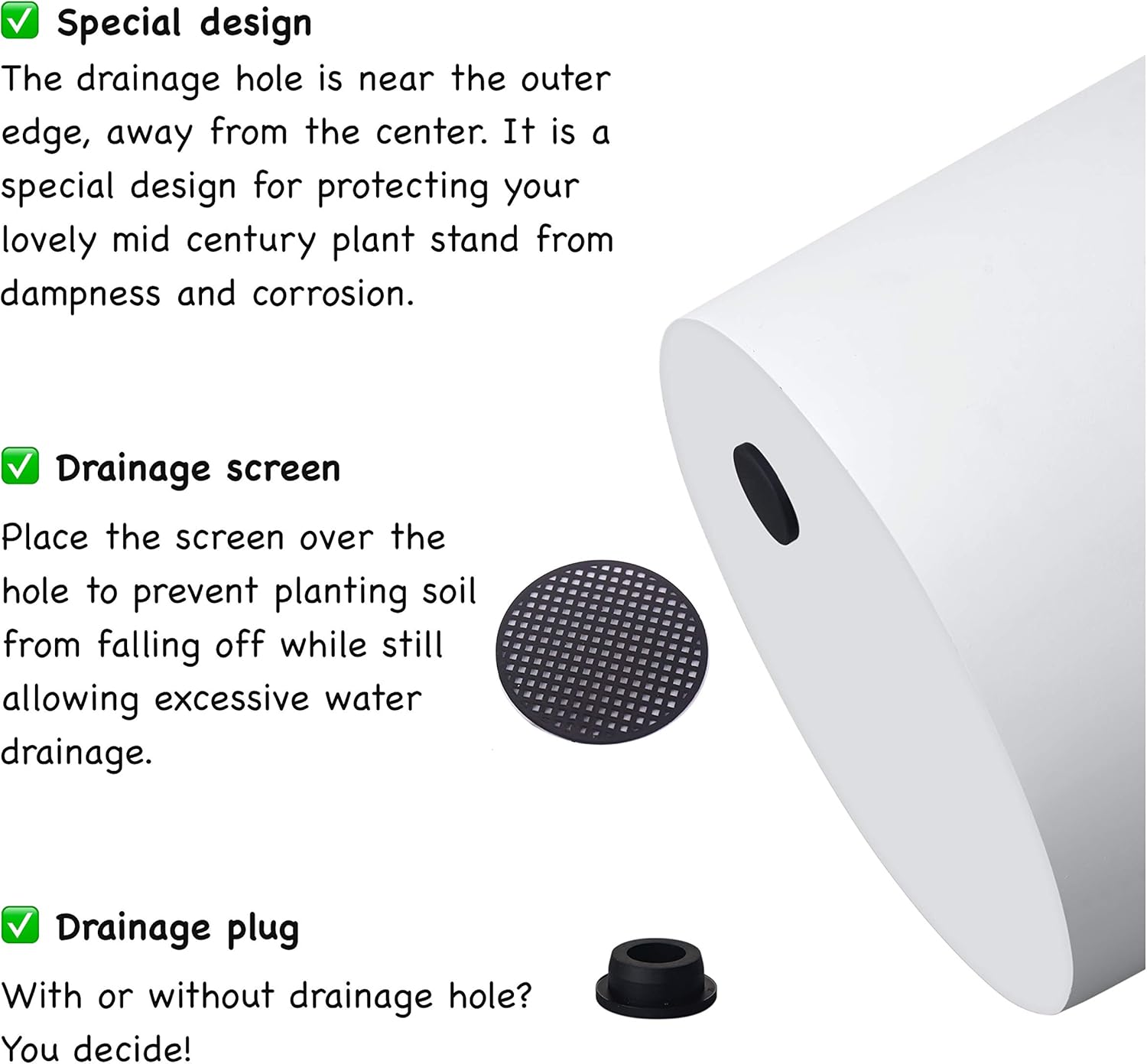 - DRAINAGE PLUG & MESH SCREEN - With a large drainage hole at the bottom of planter pot for appropriate draining, each pot contains a rubber drainage plug, your choice of draining your plants or not. It also comes with drainage mesh screen, place the screen over the hole to prevent planting soil from falling off while still allowing excessive water drainage.