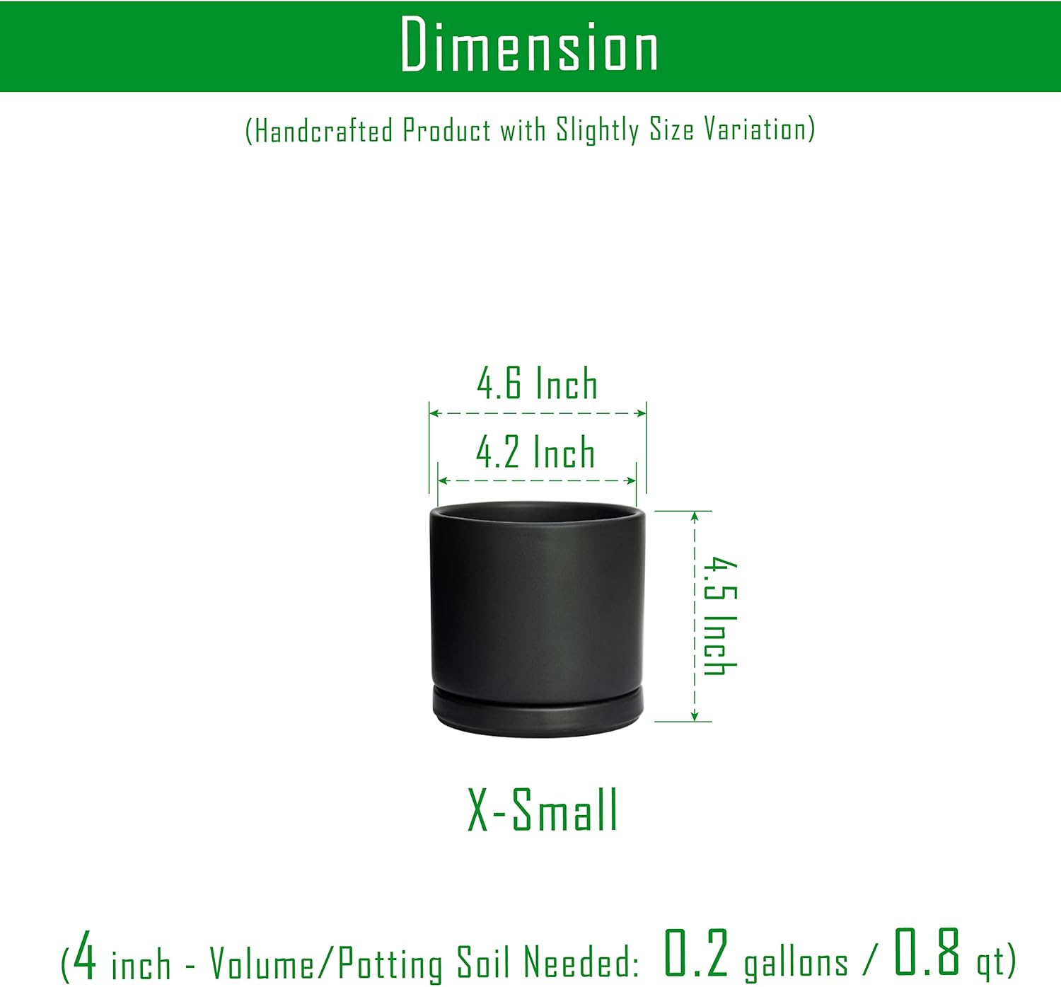 - Set of 4 Small Planter Pots - 4.6" Diameter (4.2" Inner Diameterrr) * 4.5" Height. Volume: 0.2 gallons; Potting Soil Needed 0.8 qt.