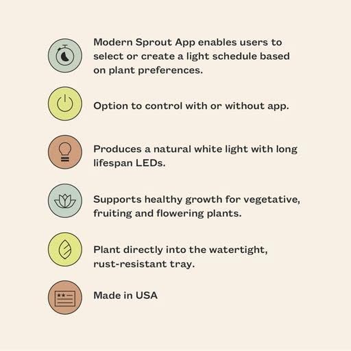 - SMART APP ENABLED: Features manual on/off switch, and can be connected to the Modern Sprout App for customizable programming and pairing recommendations for partial shade, partial sun and full sun plants.