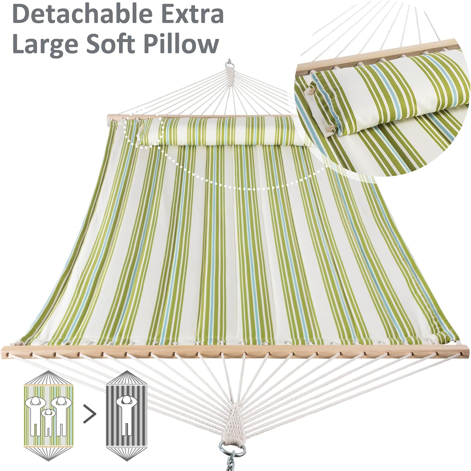 - Comfortable and Non-fading: Two-layer quilted polyester fabric with poly fiber filling which is cozier, best for camping and outdoor activities. Compared to other quilted hammocks, it will not fade after long-term usage. A polyethylene-stuffed head pillow offers superior comfort