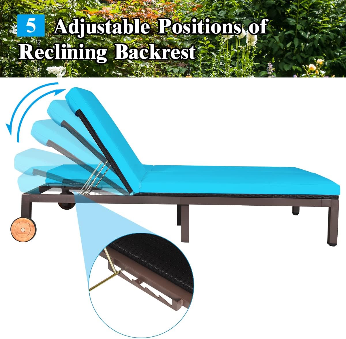 Tangkula 2-Person Patio Lounge Chair, Outdoor Rattan Double Wicker Daybed Chaise Lounge Chair with Adjustable Backrest Wheels & Cushion, Patio Sofa for Garden Lawn Backyard (Turquoise)