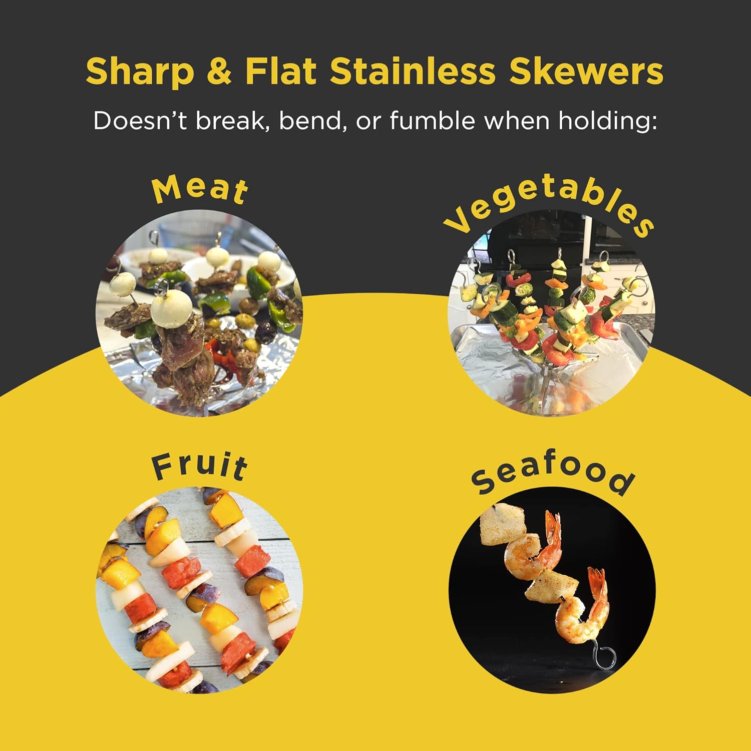 - FLAT METAL DESIGN FOR EVEN COOKING: Our flat barbecue skewers prevent food from rotating during grilling, ensuring each ingredient is evenly cooked. The angled sharp tip easily pierces through a variety of foods, including chicken, beef, seafood, and fruits, providing a smooth grilling process.