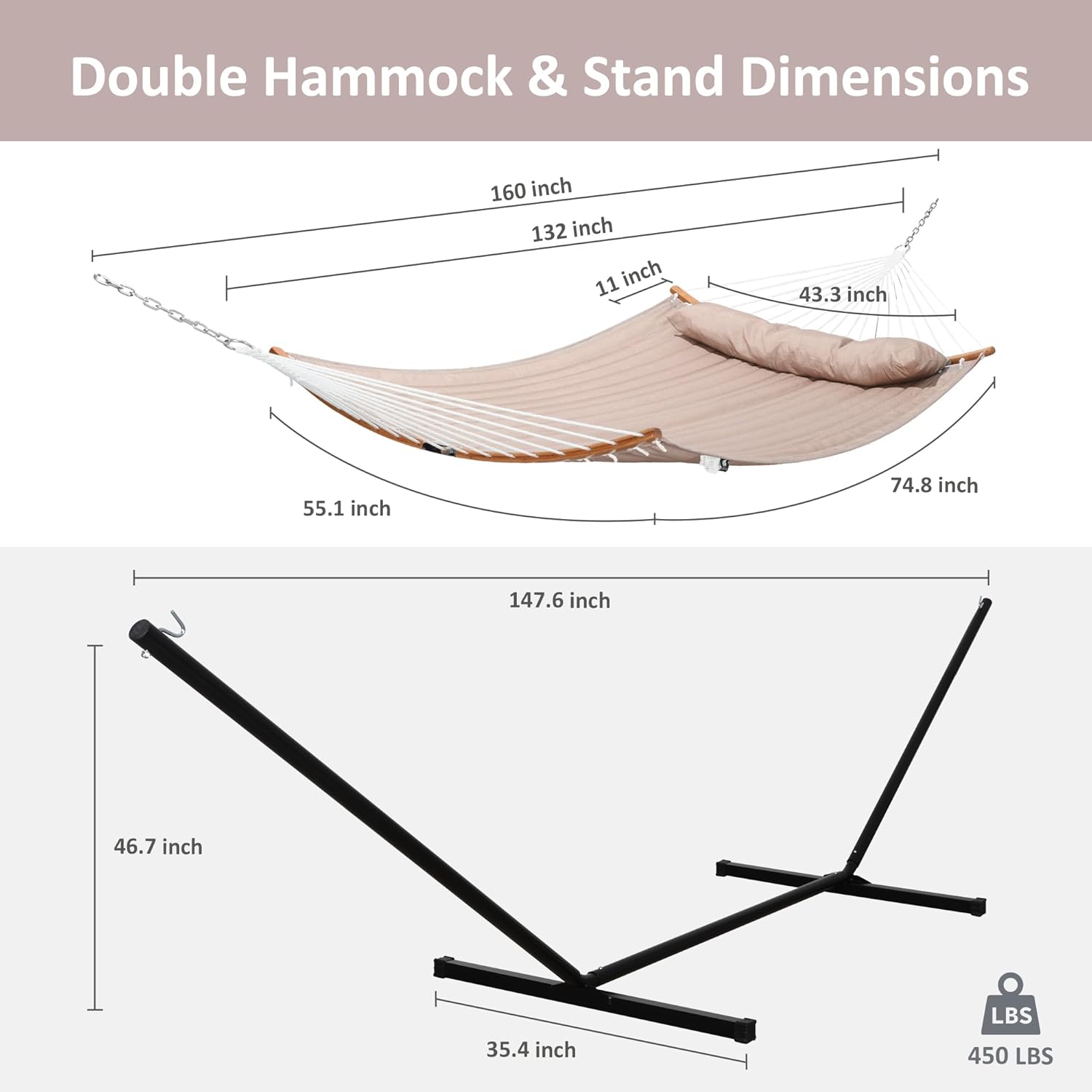 - Extra Large Size: Larger hammock bed size of 74.8" L * 55.1" W. Hammock pillow size: 43.3” (L) x 11.0” (W). This heavy duty hammock is made for sharing. Designed to support up to 450 pounds, you may enjoy a relaxing swing on the hammock with family, friends and significant others
