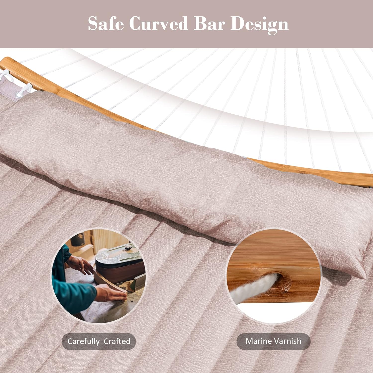 - Curved Spreader Bar & Balance Ropes: 55 inch spreader bars with marine varnish to seal are stylish and weather resistant. And the bar could be knocked down for easy storage and carriage. Comes with balance ropes, SUNCREAT hammock combo cares more about your safety. Don’t need to worry about flipping over any more