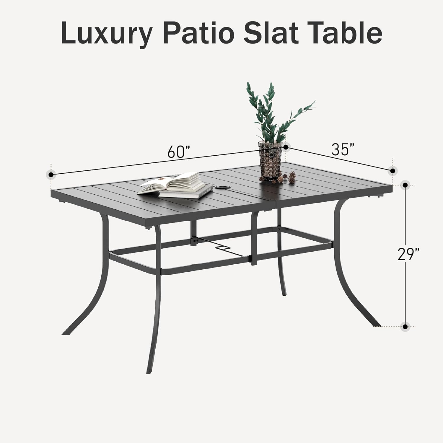 - Table Size: L60" x W35" x H28", suits for 6-8 people; 2.6" diameter of umbrella hole in the center fits most umbrellas, means you can protect your food and guests from the bright sun.