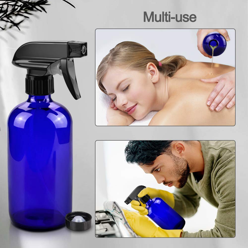 Glass Spray Bottles, 16oz Refillable Containers, Empty Boston Round Bottles with Labels & Adjustable Nozzle for Cleaning, Gardening, Aromatherapy, Pets, Plant, Hair -Blue (2 Pack)
