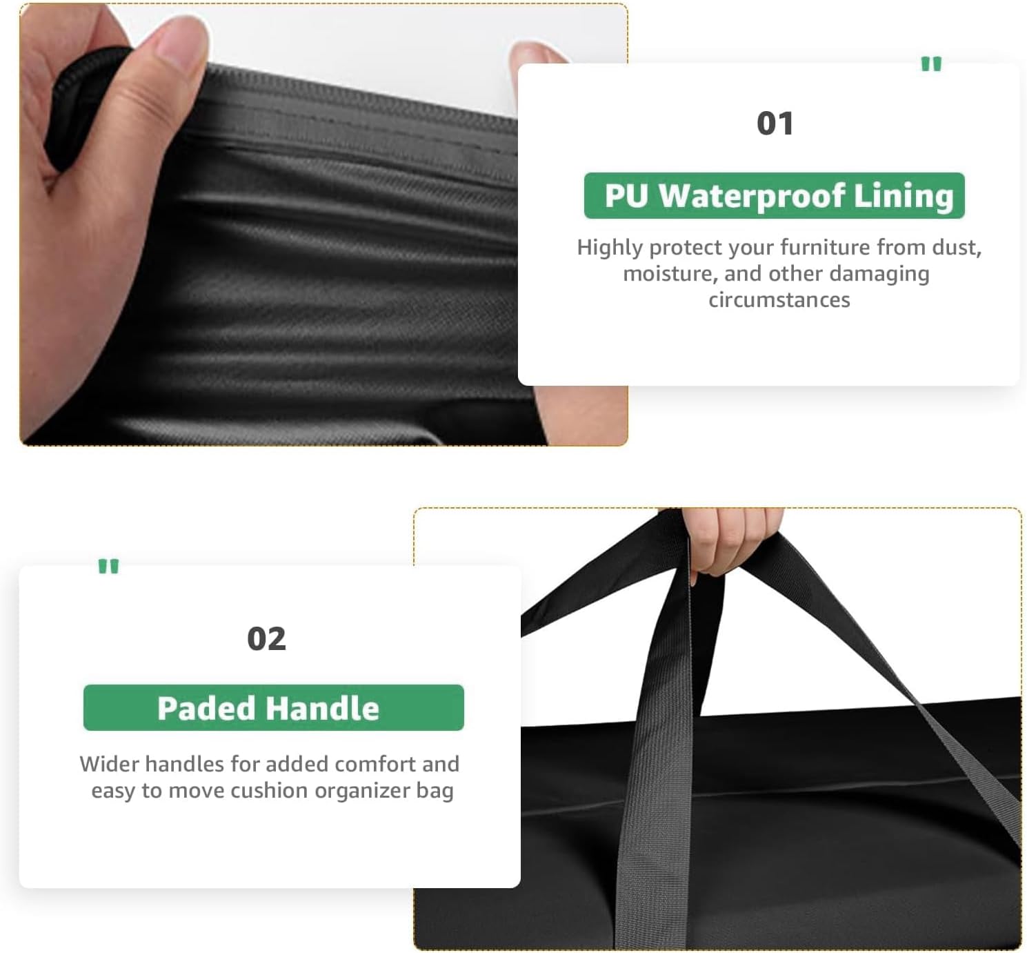 - 【Zipper & Handles】- This outdoor cushion storage bag is designed with flexible zipper that can cover the patio cushion quickly and easily. Durable and non-slip handles are helpful to carry conveniently cushion storage bag.