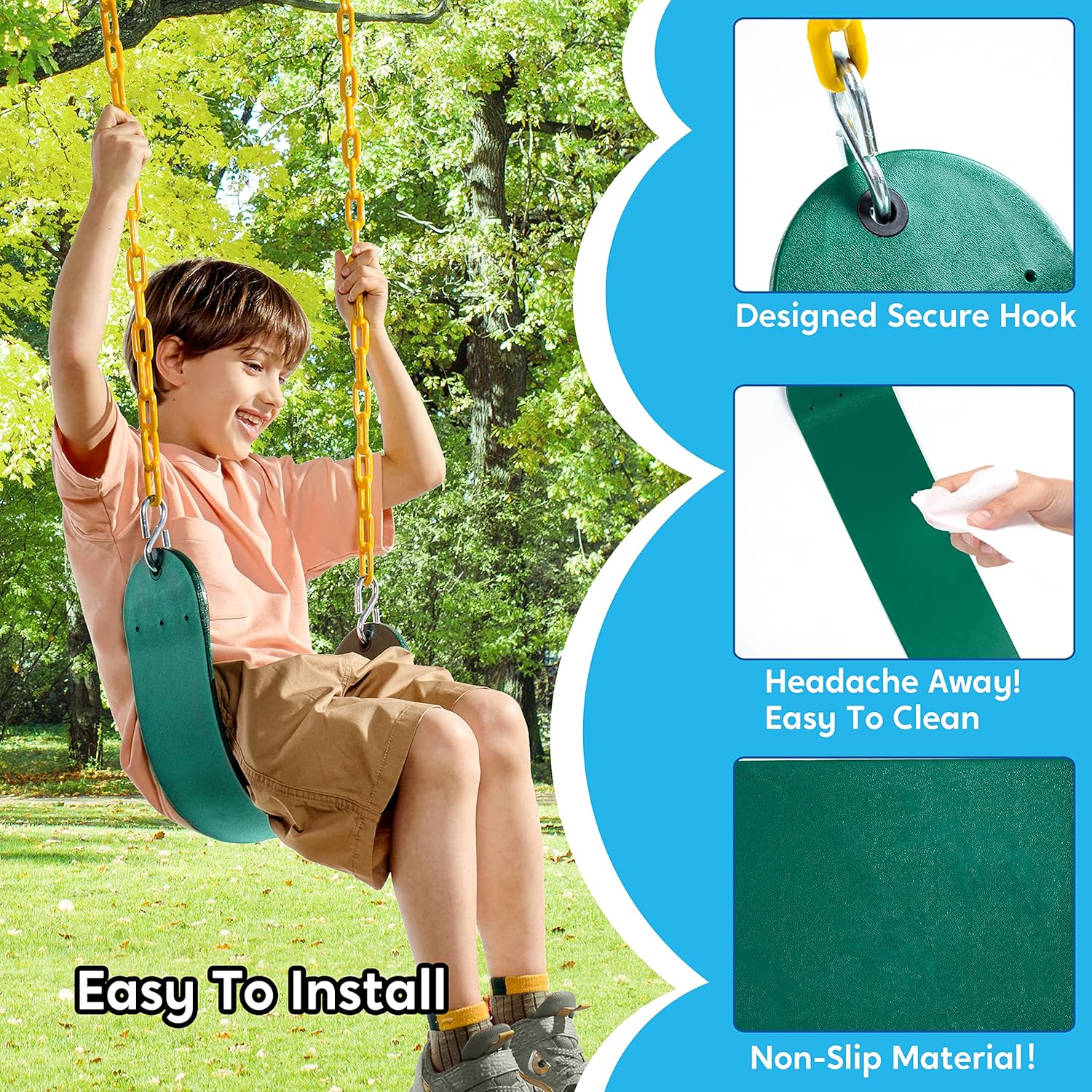 TURFEE Heavy Duty Swing Seat Green Color with 66” Chain, Swing Set Accessories Replacement with Snap Hooks for Kids Outdoor Play Playground