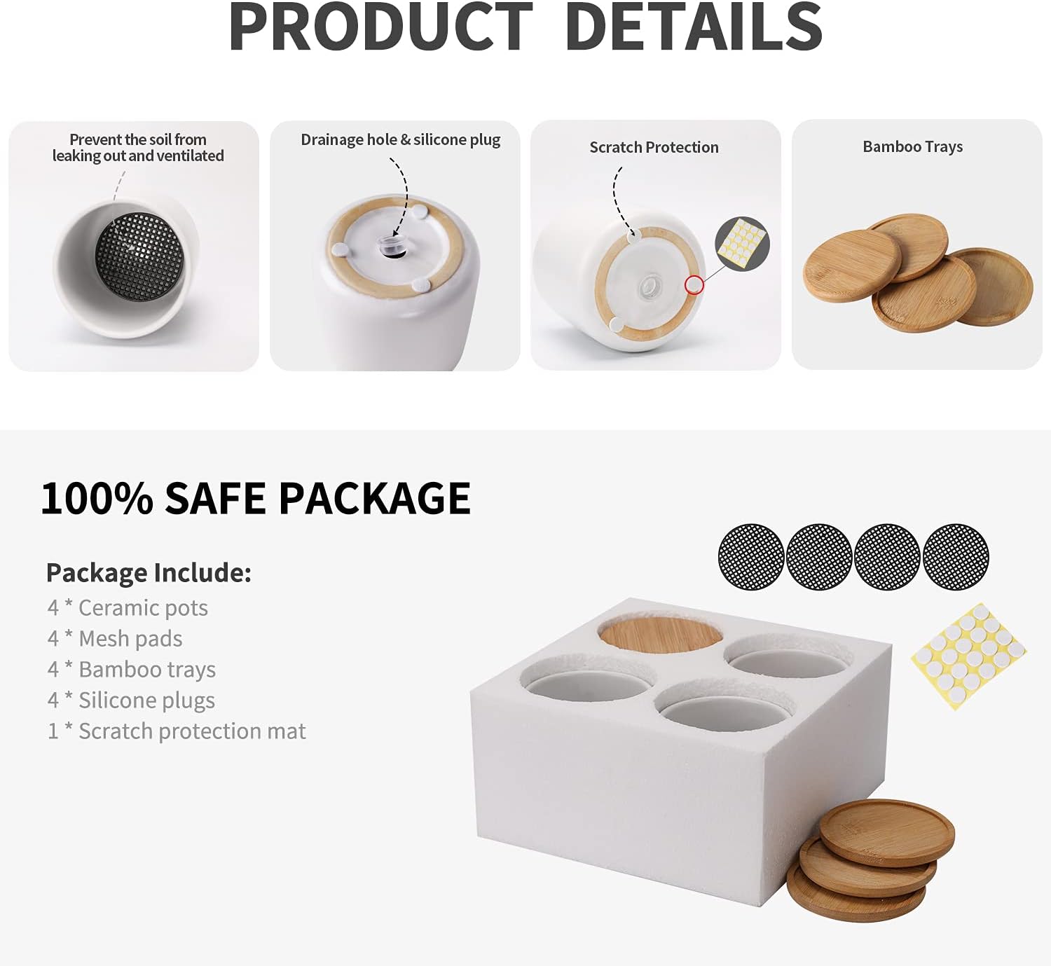 4 Inch Ceramic Plant Pots with Drainage Holes and Trays, Adorable Small Cylinder Flower Planter Pot with Saucers for Indoor Plants, Succulent, Snake Plants, Cactus & Herbs, White, Set of 4