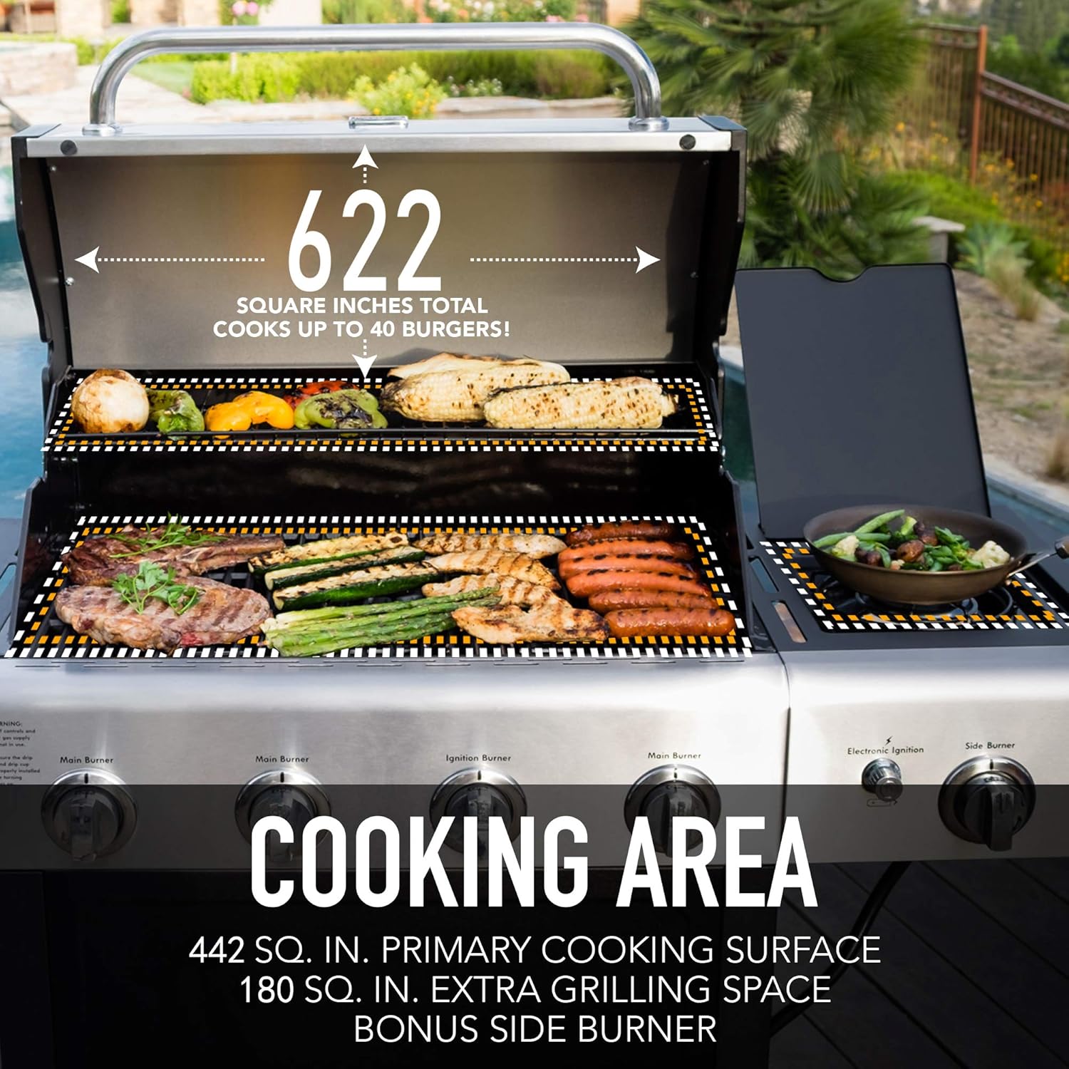 - Spacious Grilling Area – Offers 626 square inches of total cooking space, including 442 square inches of primary grilling surface and a 180-square-inch warming rack, so you can grill for a crowd without overcrowding.