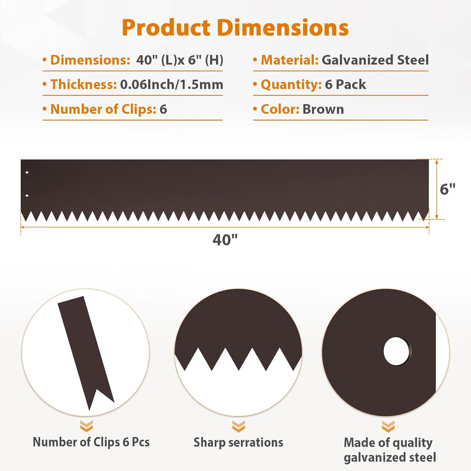 - Enhancement Kit - Each set includes 6 steel edges, measuring 40 inches (length) x 6 inches (width), and 6 clips for efficient installation. Experience the convenience and quality of our steel garden edges, adding brilliance and color to your landscape project