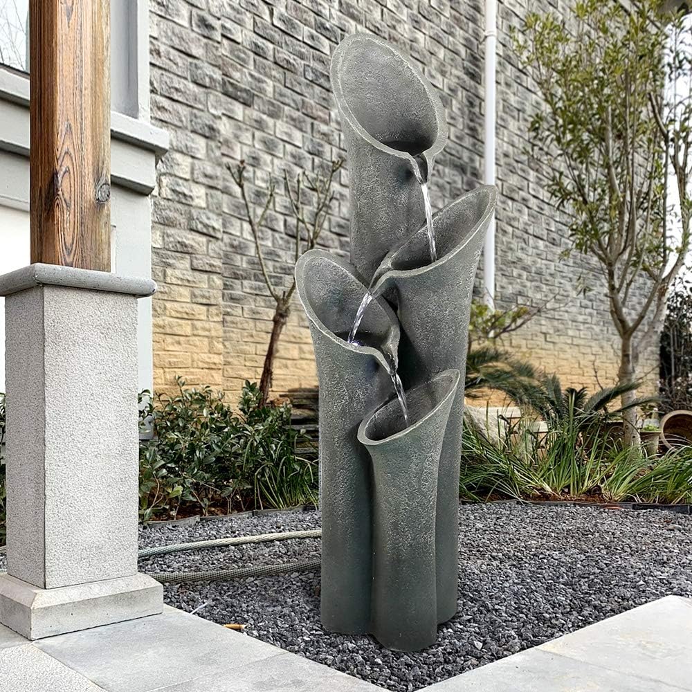 - This fountain is lit with LED lights for evening enjoyment.This cascading outdoor fountain is an easy way to bring tranquility and serenity to both indoors and outdoors.