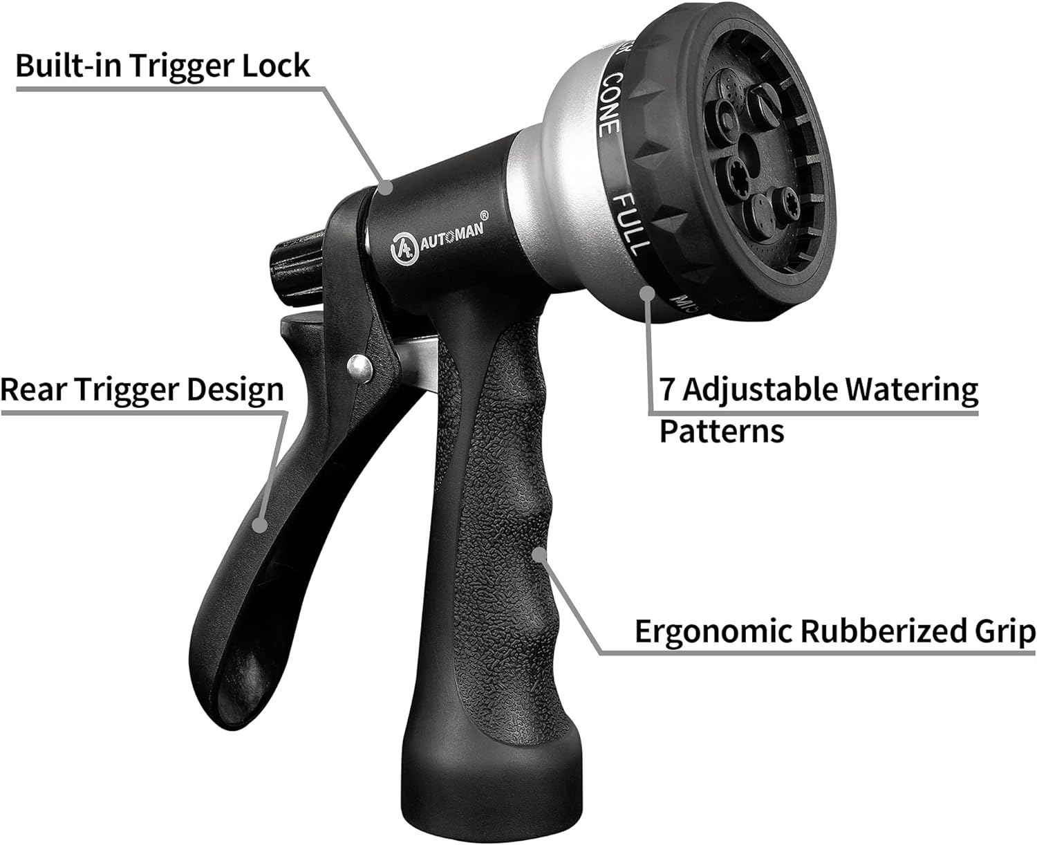 - LABOR-SAVING DESIGN: AUTOMAN garden nozzle features a nice lock bar at the top of the handle that keeps the water remains on without you having to apply any pressure.Just use the lock so you don't have to keep your hand holding it the whole time.