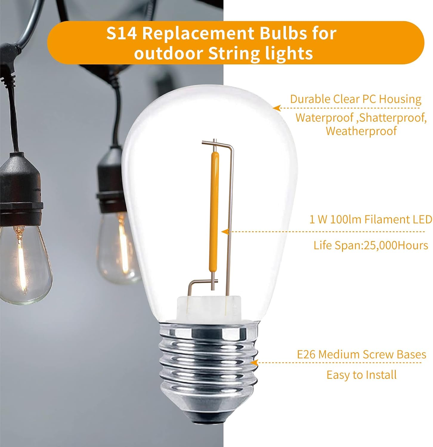 - Durable and Wide Application: The operation life of light bulbs up to 25,000 Hrs, no worry to replace light bulbs frequently. Extreme weather conditions do not affect the normal use of light bulbs, S14 string light bulbs are suitable for both outdoor string lights and indoor lighting, including bistro lights and patio illumination, outside garden, camp, party.