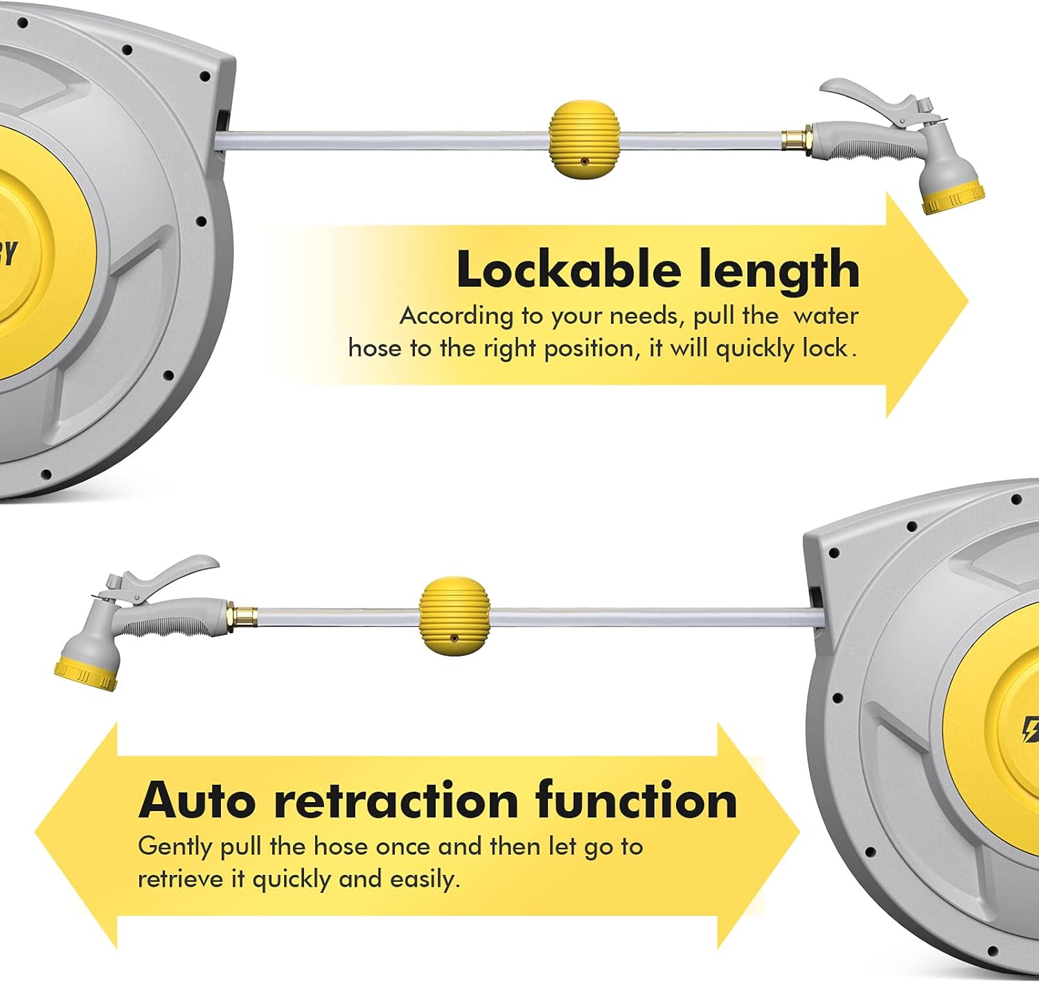 - Lock at Any Length: our water pipes can be recycled automatically. When you pull out the water pipes, the water pipes will be locked when you stop them; when you pull them lightly, the water pipes will return to the hose reels for outside at a uniform speed. Our garden hose reels have their own automatic locking and recycling mechanism After nearly 10 years of verification, our function is very trustworthy.