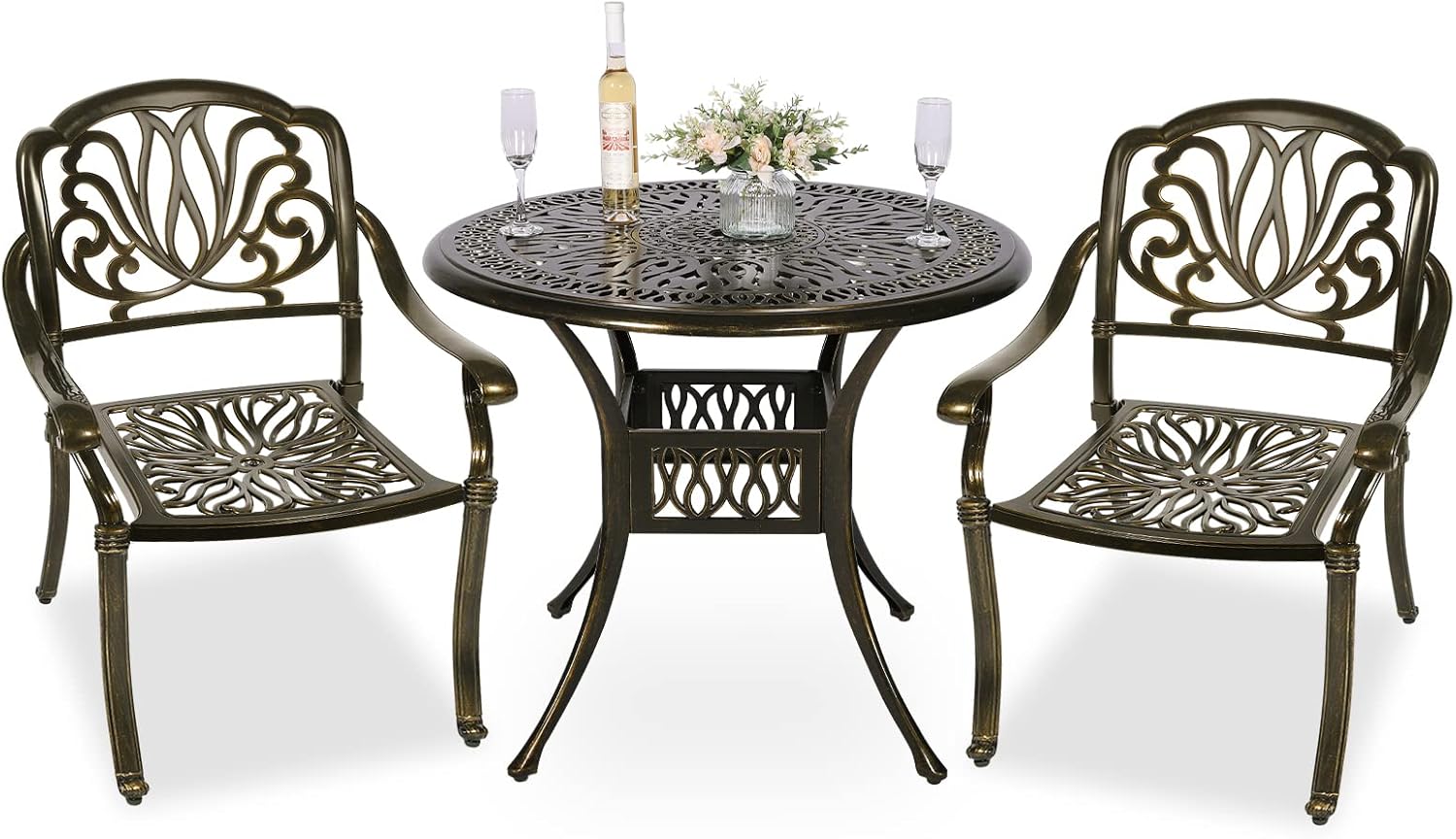- 【Dimensions】 - Our round table is 35.4"(Dia) x 29.5"(H), and each of 2 chairs is 26"(L) x 27.2"(W) x 36"(H), you’ll love how this furniture set uniquely accents your space. Quickly assemble so you can enjoy it in no time, all hardware, tools and instructions required are included for easy assembly. Over this summer to show off your new, stylish, cast aluminum dining set to everyone