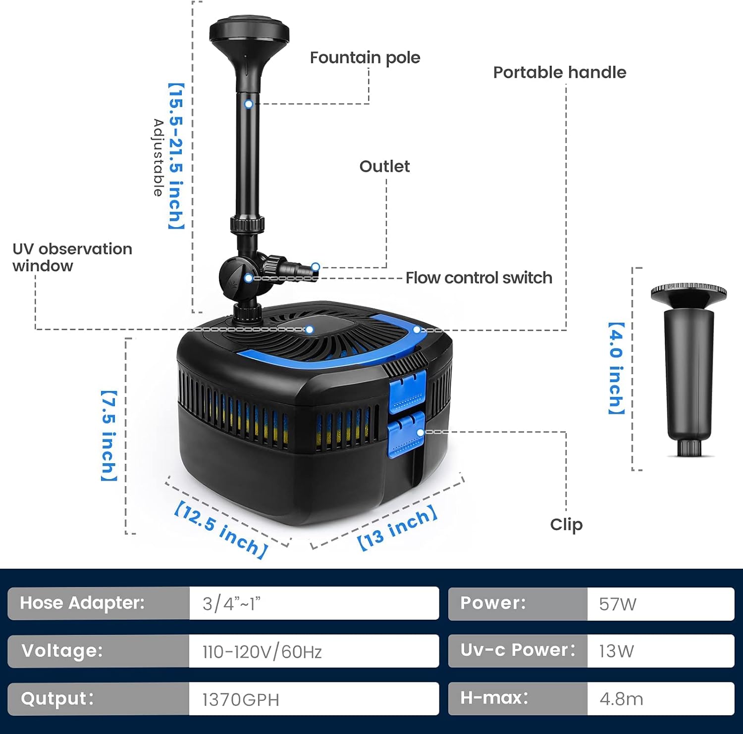 - 4 in 1 Multifunctional System: 1. Filtration: The pond pump can filter multiple times to purify the water quality. 2. Lamp: 13W work lamp effectively inhibit aquatic organisms and keep fish clean and healthy. 3. Pumping: The pumping flow can be adjusted to meet the daily pumping needs of the pond. 4. Fountain: Two fountain styles add charm to your pond.