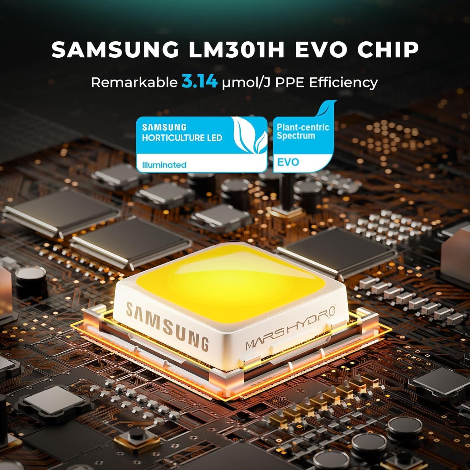 - Supreme Efficiency: The light is equipped with Samsung LM301H EVO LEDs , which are rated at 2298 μmol/m²/s, have a PPE of 3.14 µmol/J per diode, and provides an overall PPE of 2.95 μmol/j. It is a high efficacy and reliability LED package designed for Commercial Planting.