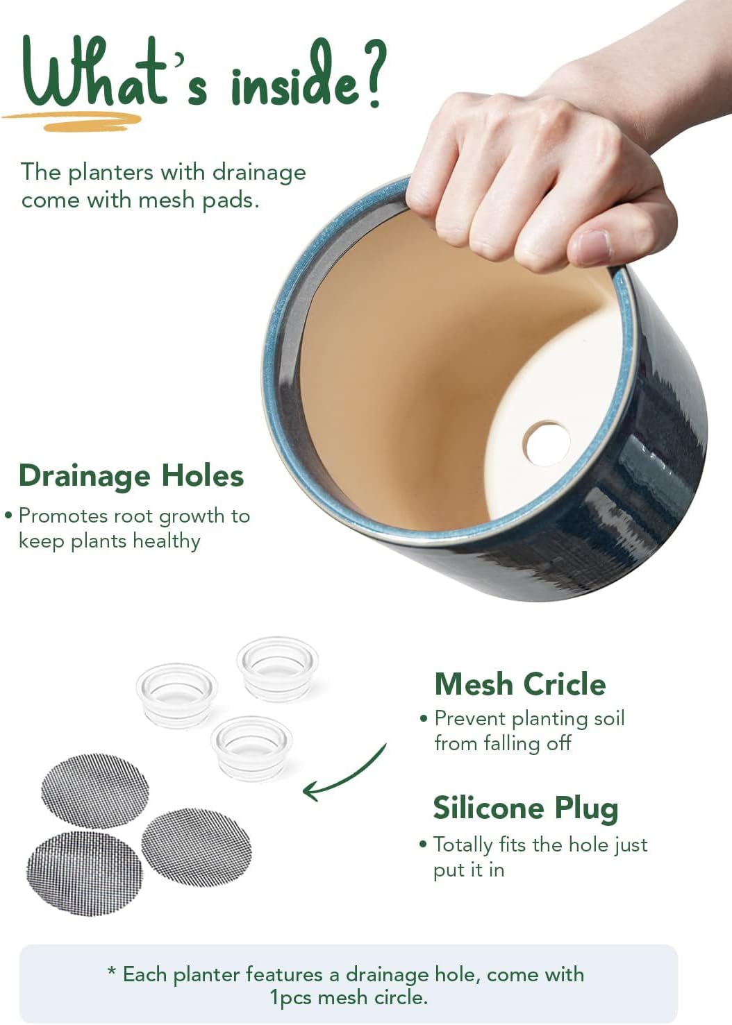 - Thoughtful Accessories: To drain or not to drain, it's all up to you; roots love moisture but are afraid of excessive water; use a silicon plug to prevent water leakage, or cover the drainage hole with a mesh pad to prevent soil loss, offering good ventilation for plants to breathe without restriction (Plant is NOT included)Thoughtful Accessories: To drain or not to drain, it's all up to you; roots love moisture but are afraid of excessive water; use a silicon plug to prevent water leakage, or cover the drainage hole with a mesh pad to prevent soil loss, offering good ventilation for plants to breathe without restriction (Plant is NOT included)