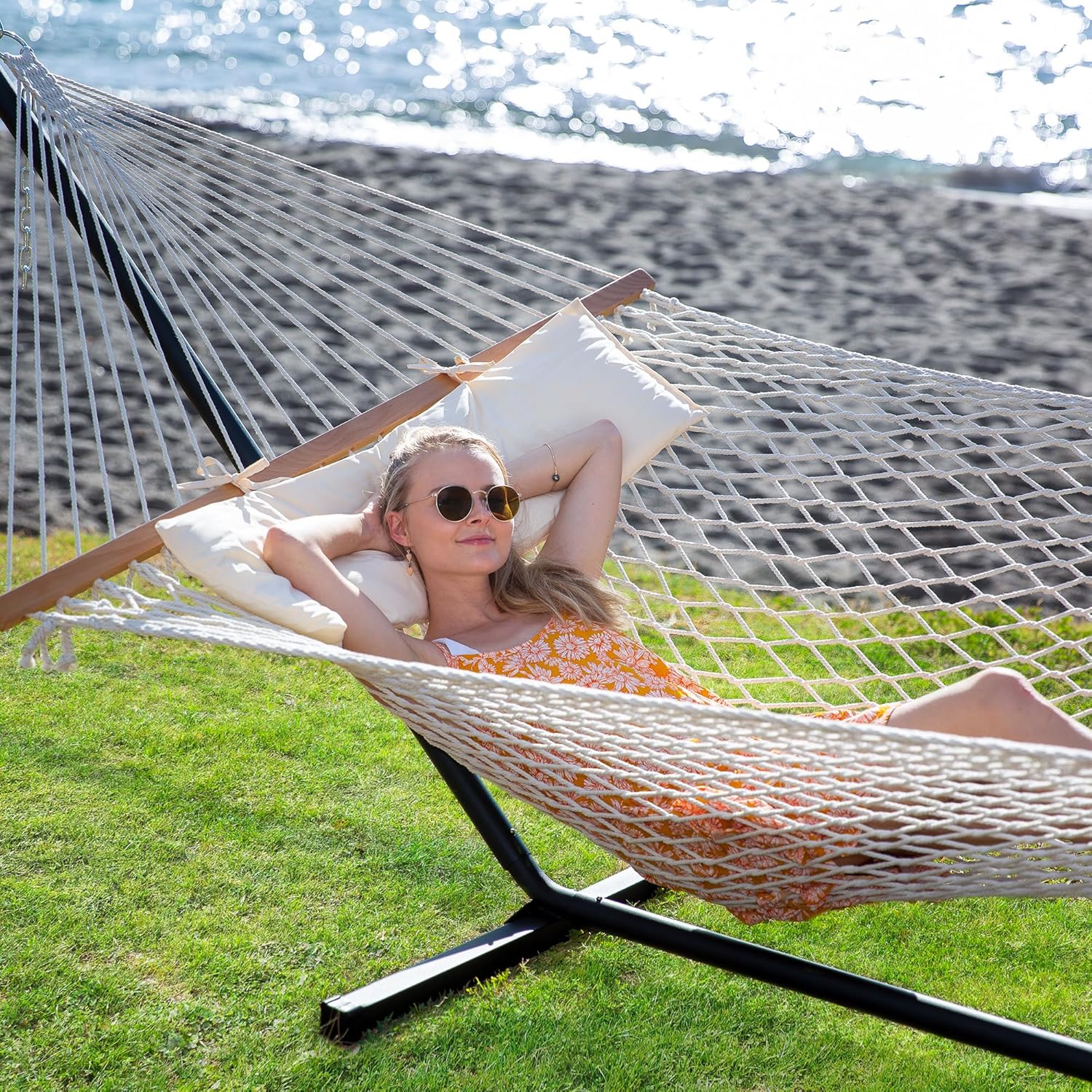 SUNCREAT Double Outdoor Hammock with Stand Included, Portable Cotton Rope 2 Person Hammock for Outdoor, Patio, Garden, Backyard, Beige