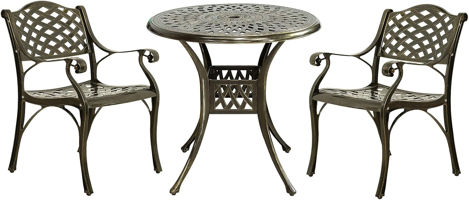 - 【Dimensions】 - Our round table is 31"(Dia) x 29.5"(H), and each of 2 chairs is 22.4"(L) x 22.4"(W) x 33"(H), you’ll love how this furniture set uniquely accents your space. Quickly assemble so you can enjoy it in no time, all hardware, tools and instructions required are included for easy assembly. Over this summer to show off your new, stylish, cast aluminum dining set to everyone