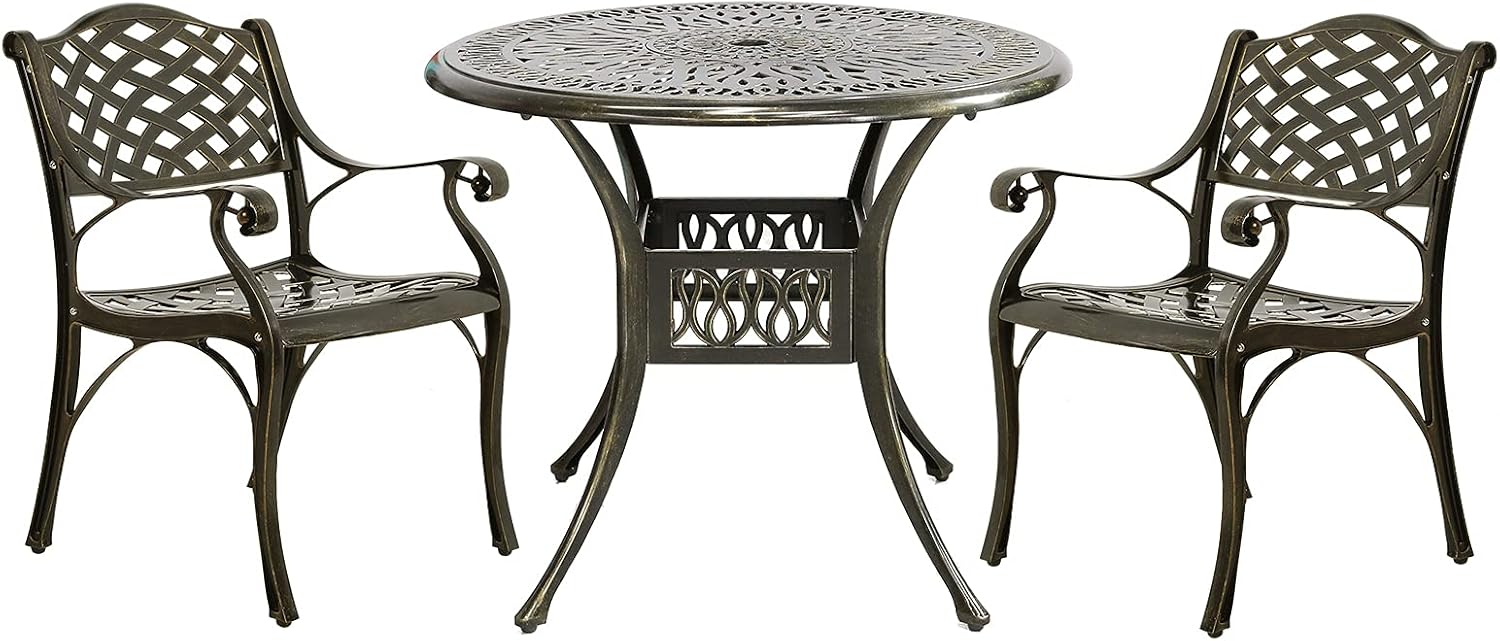 - 【Dimensions】 - Our round table is 35.4"(Dia) x 29.5"(H), and each of 2 chairs is 22.4"(L) x 22.4"(W) x 33"(H), you’ll love how this furniture set uniquely accents your space. Quickly assemble so you can enjoy it in no time, all hardware, tools and instructions required are included for easy assembly. Over this summer to show off your new, stylish, cast aluminum dining set to everyone
