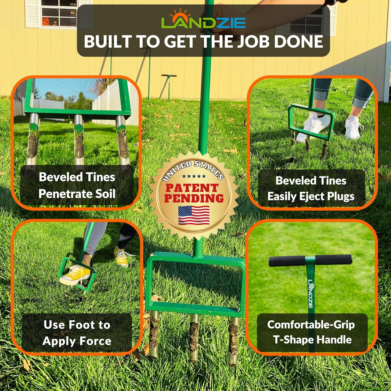 - REVOLUTIONARY CLOG-FREE BEVELED TINES: Landzie has revolutionized the core aerator lawn tool industry by designing a hollow tine lawn aerator tool and lawn core aerator that removes cores of soil. Three solid, stainless steel tines break up soil and allow air, water, and nutrients to penetrate more deeply into the soil, pushing old material up and out of the manual aerator lawn tool each time you press the Landzie Plug Lawn Aerator into the ground. No need to unclog your manual core aerator