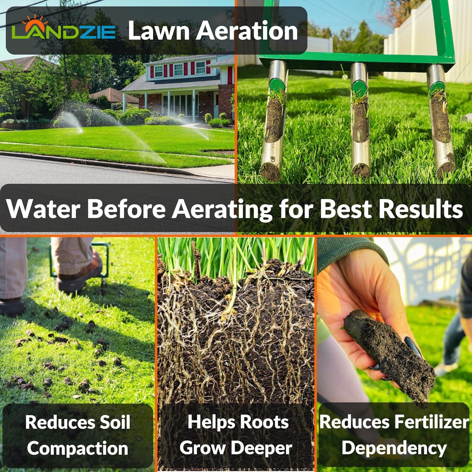 - HAVE THE LAWN OF YOUR DREAMS: Revitalize your lawn by using the Landzie Fork Lawn Plug Aerator to remove compacted soil and thatch and promote healthy grass growth. Aerator coring your lawn encourages healthy root growth, enhances resistance to drought and flooding and reduces the need for excessive amounts of fertilizer. USE your Landzie Soil Aerator with the Landzie Compost Spreader and Peat Moss Spreader and the Landzie Lawn Leveling Rake for a lush and green lawn this season