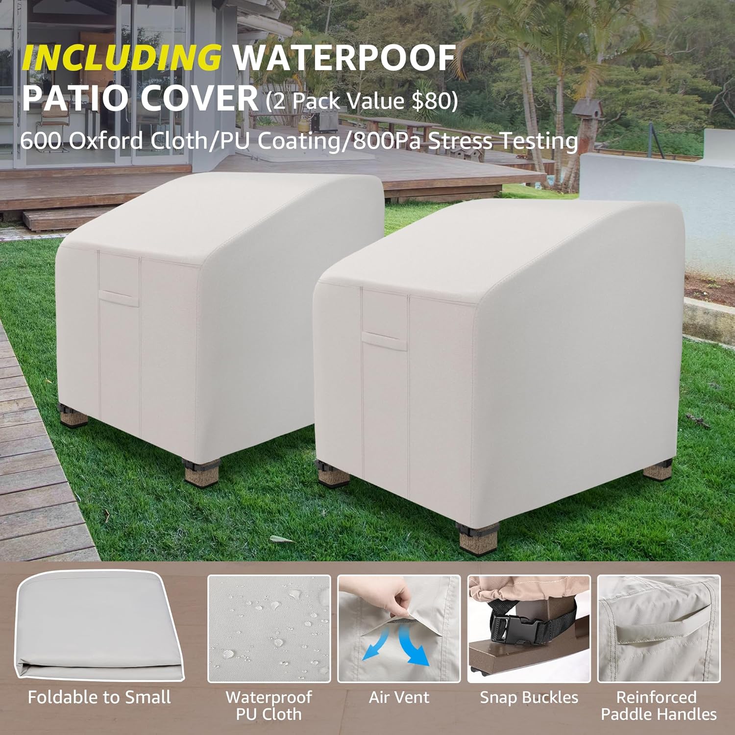 - 2 Pack Outdoor Chair Covers Included:Large Waterproof PU coating cover included can protect luxurious patio chairs set as well as new, no need to buy and worry while not use. In Yard or back your Family and friends could sit on the rocking chairs and enjoy leisure time with you happliy.