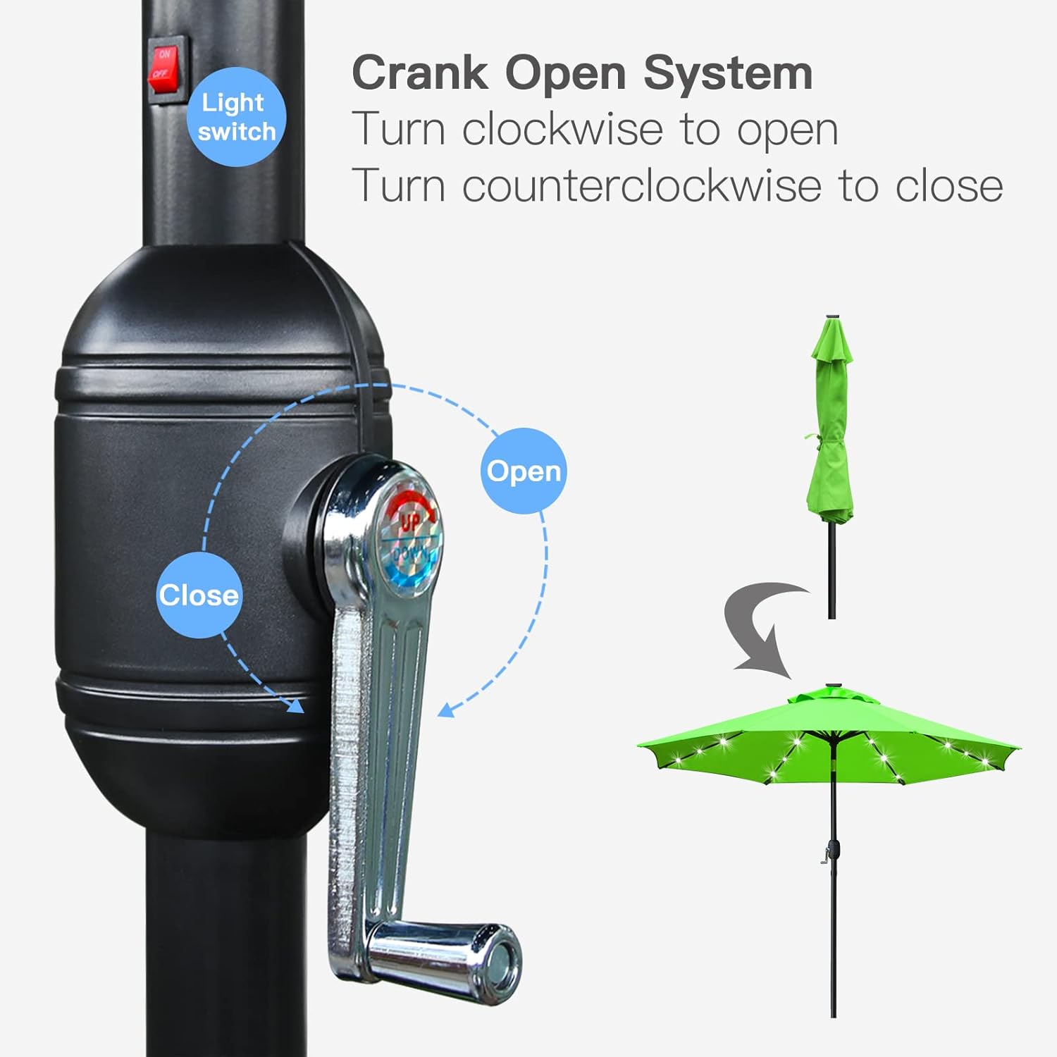 - Convenient crank opens/closes system and handy push button tilt, even easy to use for kids and the elderly. Keep the sun at the back in the daytime.