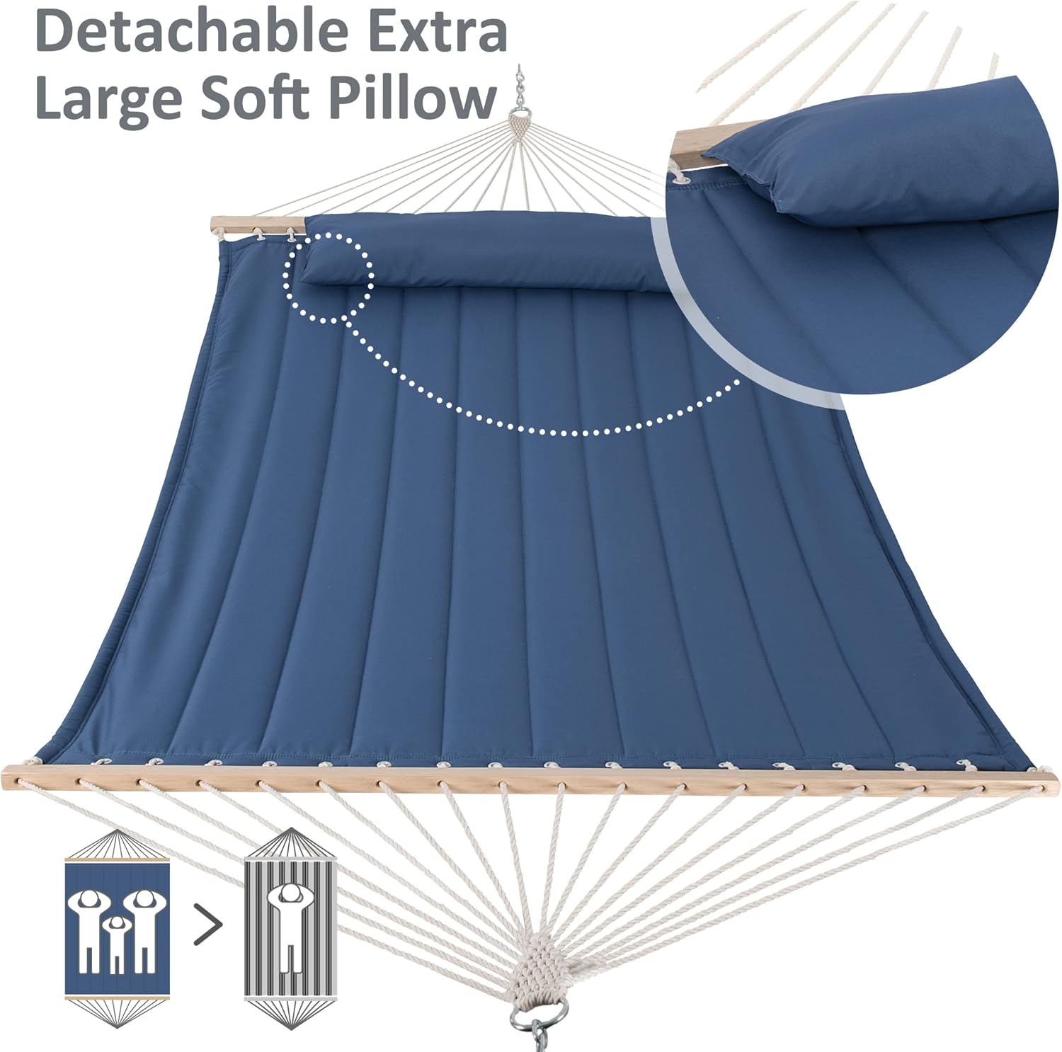 SUNCREAT Double Outdoor Hammock with Hardwood Spreader Bar, Extra Large Pillow, 475 lbs Capacity, Heavy Duty 2 Person Hammock, Blue