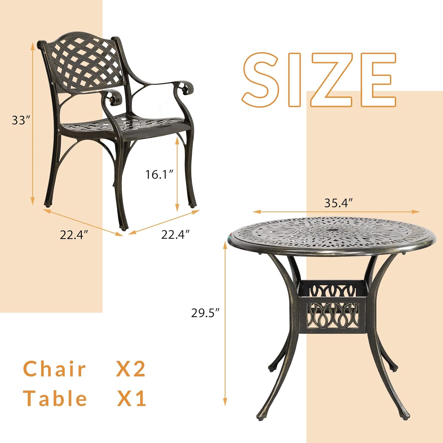 - 【Durable 3-Piece Dining Set】 - Made from cast aluminum for long-term durability. Resistant to rust, weather, fade, crack. This patio set includes 1 round table, 2 chairs, and they stay in perfect condition regardless of the weather. It's also easier than ever to clean, just use a dry or damp rag to wipe down.