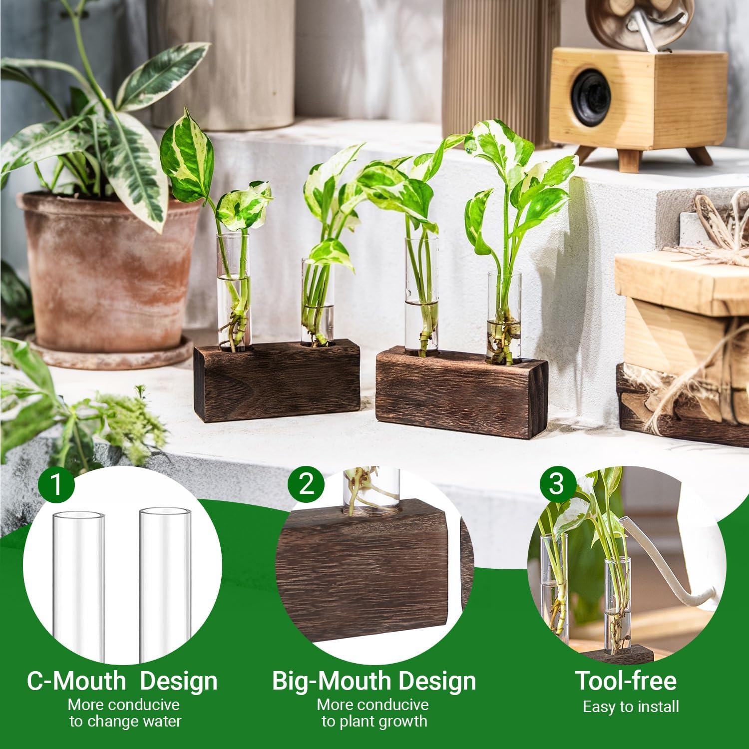 - Unique Hydroponic Plant Vase: The Glass Planter Propagation Station with a Wood Stand is perfect for starting an indoor garden.Easy to use,versatile, and adds a stylish touch to any space, making it a must-have for plant lovers.The glass test tubes are removable, allowing you to easily change and propagate new plants. This makes a great gift for any plant lover! Note: Plants and props are not included