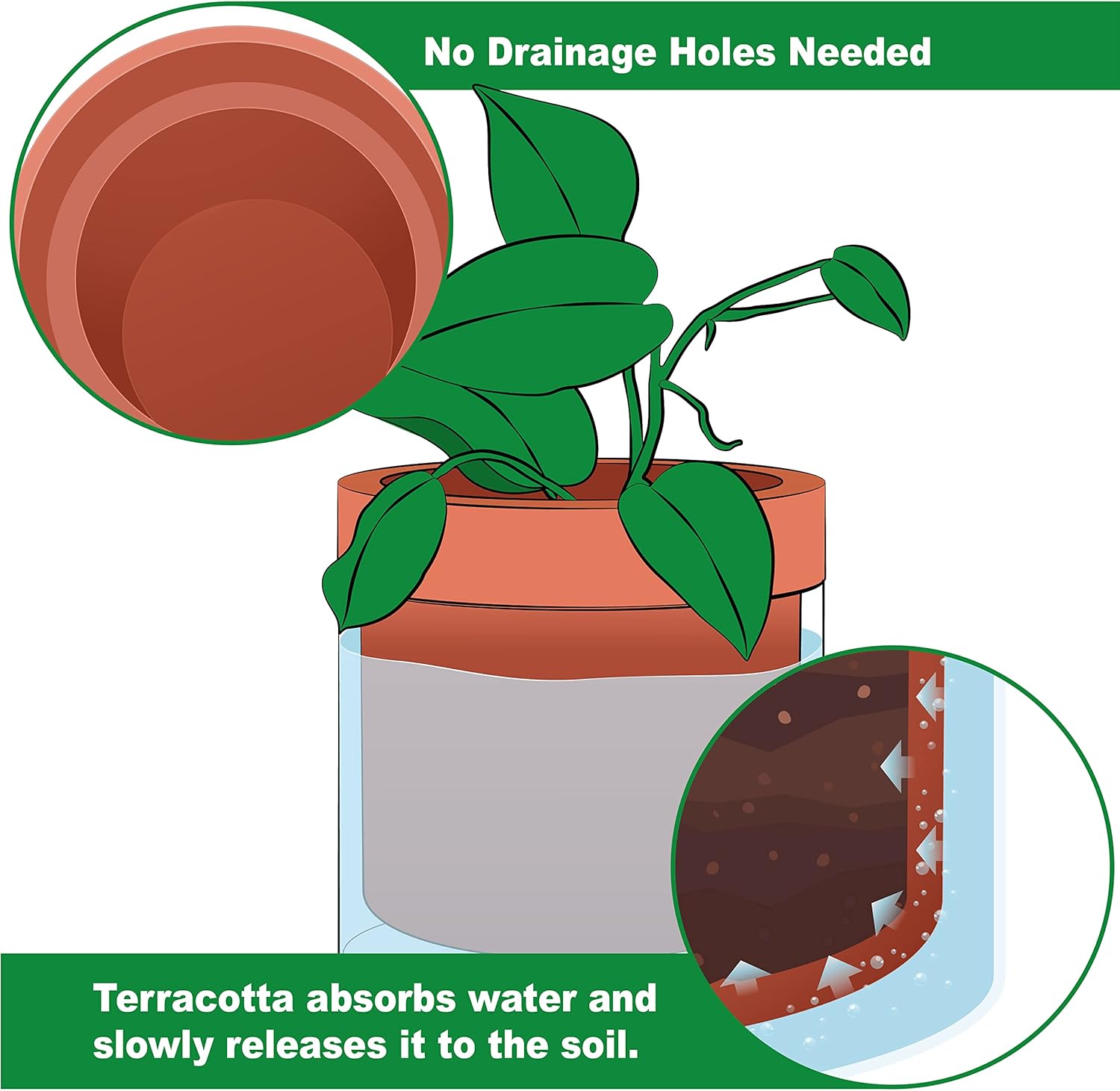 - Self-Watering System: The bottom quarter of the terracotta pot is unglazed, allowing plants to absorb water through the pot walls.