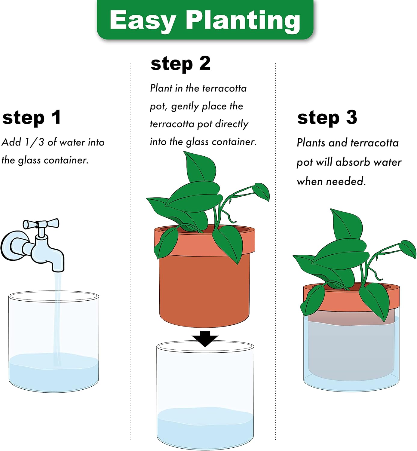 - Self-Watering System: The bottom quarter of the terracotta pot is unglazed, allowing plants to absorb water through the pot walls.