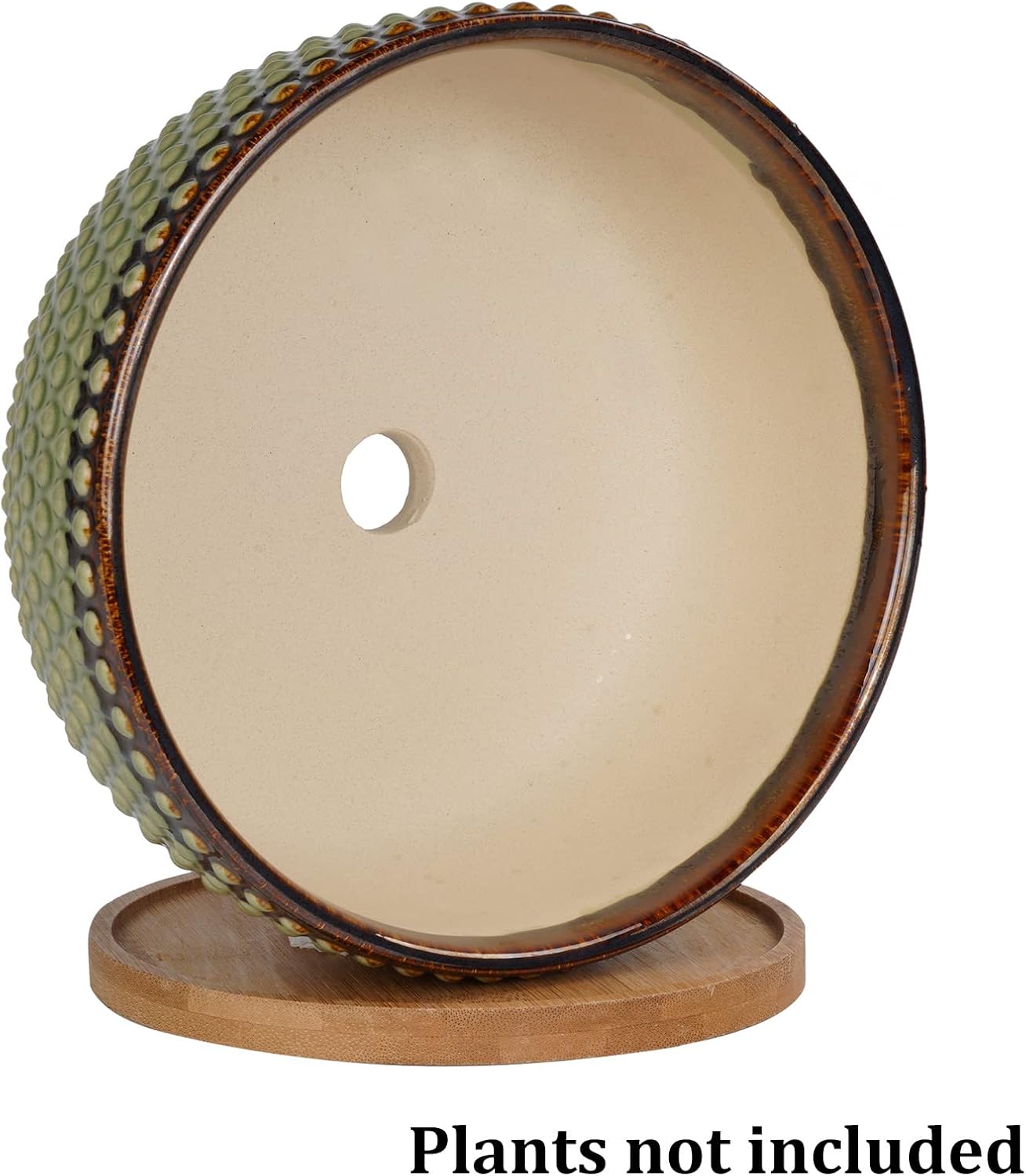 8 Inch Ceramic Succulent Shallow Planter Pot with Drainage Hole and Saucer Beaded Stoneware Planter for Indoor Plants Green