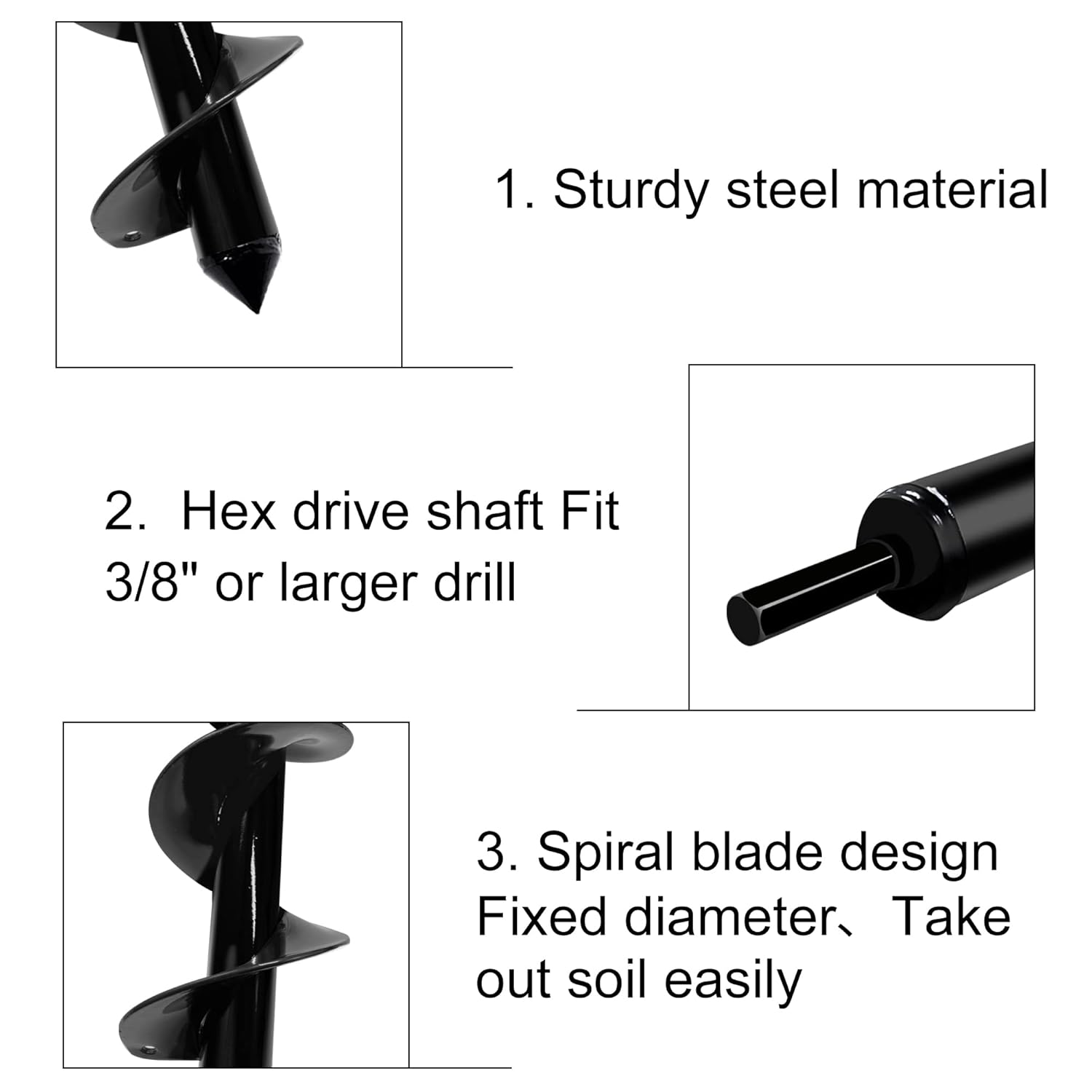 - 【STURDY AND DURABLE】 Made of heavy-duty steel and the surface is coated with high-quality black paint. Our auger drill bit set is wear-resistant, sturdy and durable, Maintain excellent performance for a long time in working with hard dirt, clay, rocky soil, sand, etc. It works with any 3/8" or larger chucked drill, and we suggest that use 18V or greater drill with adjustable drill chuck.