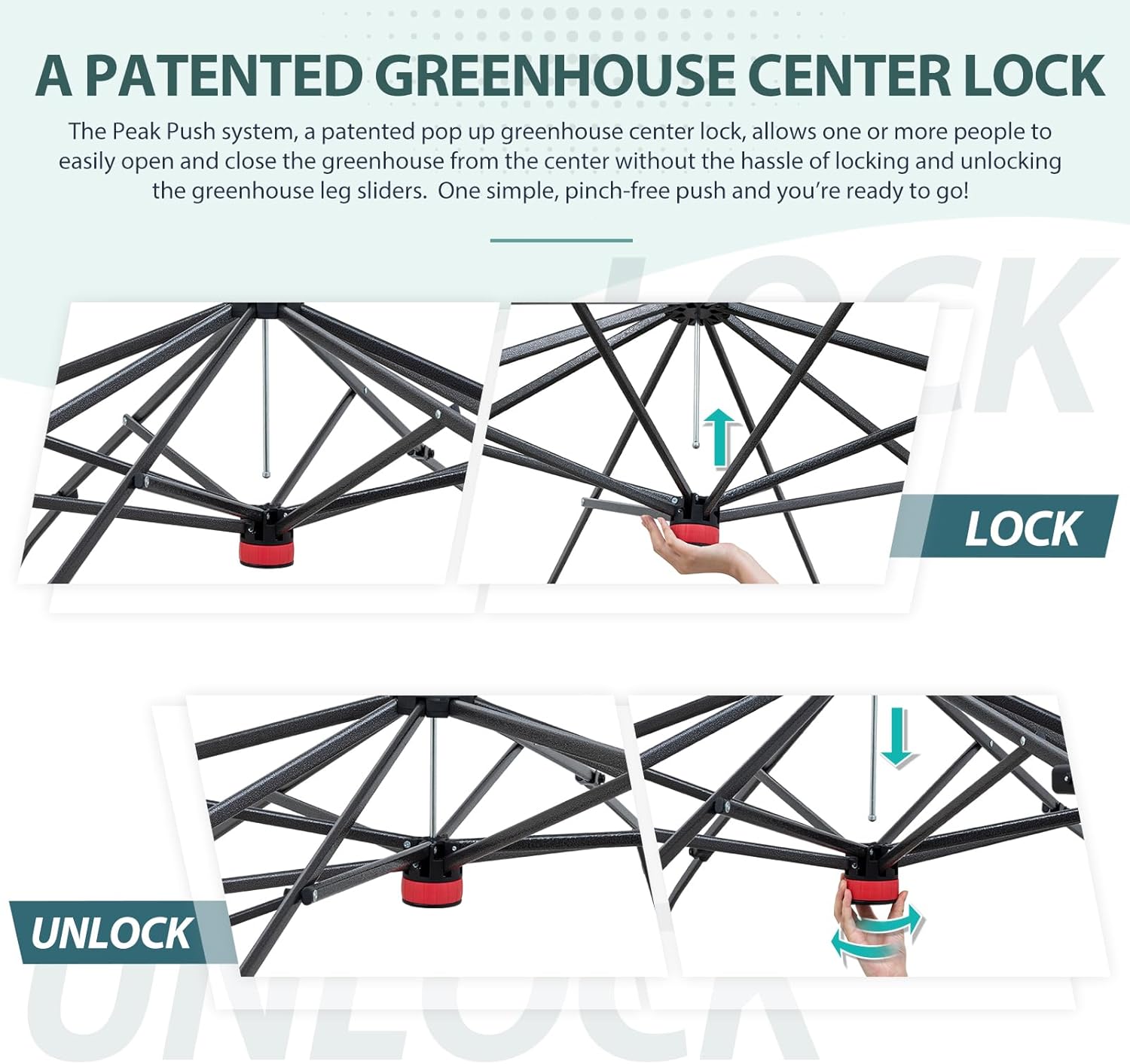 - EASY SETUP: This easy setup pop up greenhouse plant tent features the Peak Push system, a patented greenhouse center lock. The portable greenhouse requires no tools and easily opens and closes from the center in seconds. Its unique greenhouse center lock enables a quick, one person setup, letting you maximize gardening with minimal effort