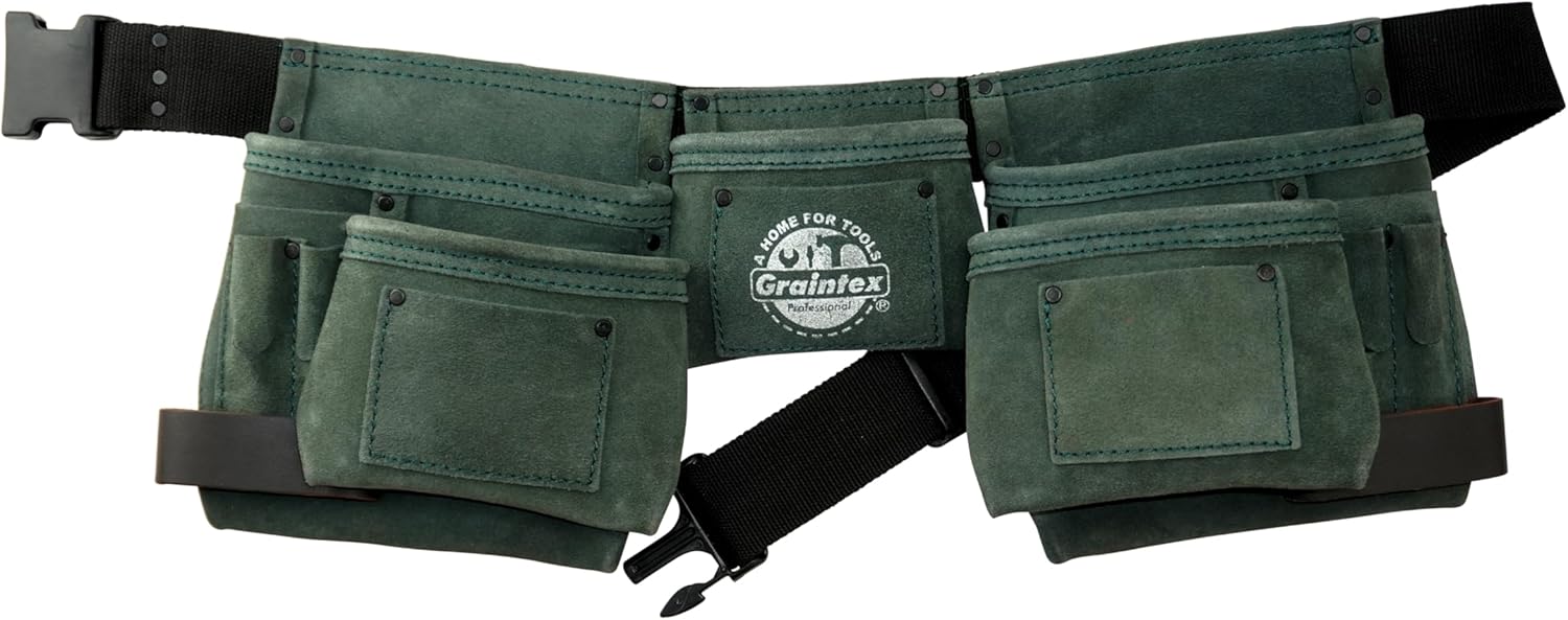 Graintex DS2388 11 Pocket Hunter Green Color Suede Leather Tool Belt/Tool Bag/Apron, 2 Hammer Loops, Adjustable Belt | Construction, Carpenter, Roofing Tools, Drywall, Gardening
