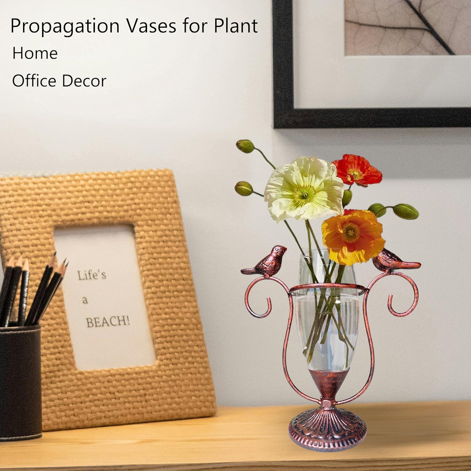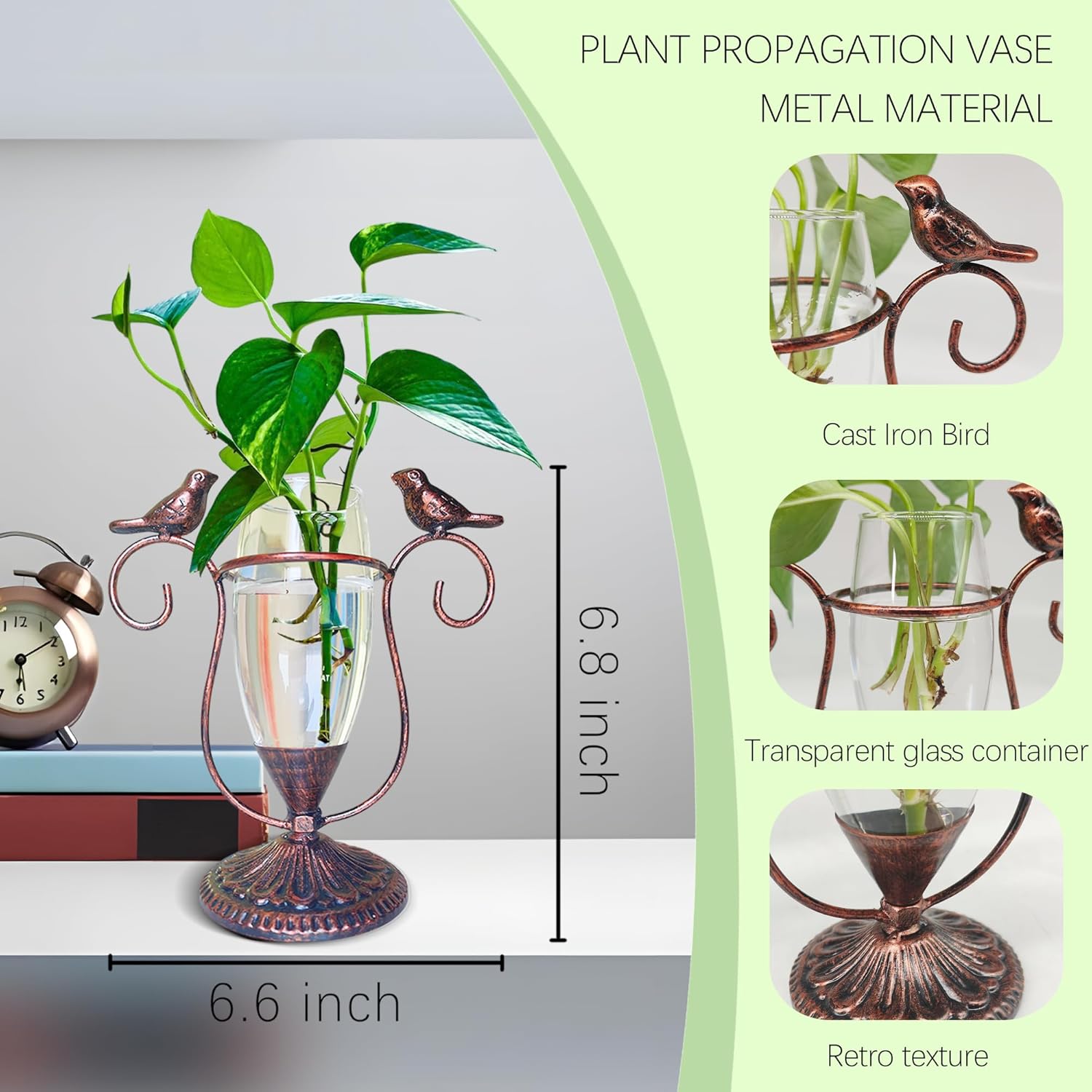 POXOH Vintage Glass Planter - Metal & Glass Propagation Vase with Dual Birds Art, Retro Indoor Planter for Hydroponic Plants, Office Desk Decor, Living Room Centerpiece