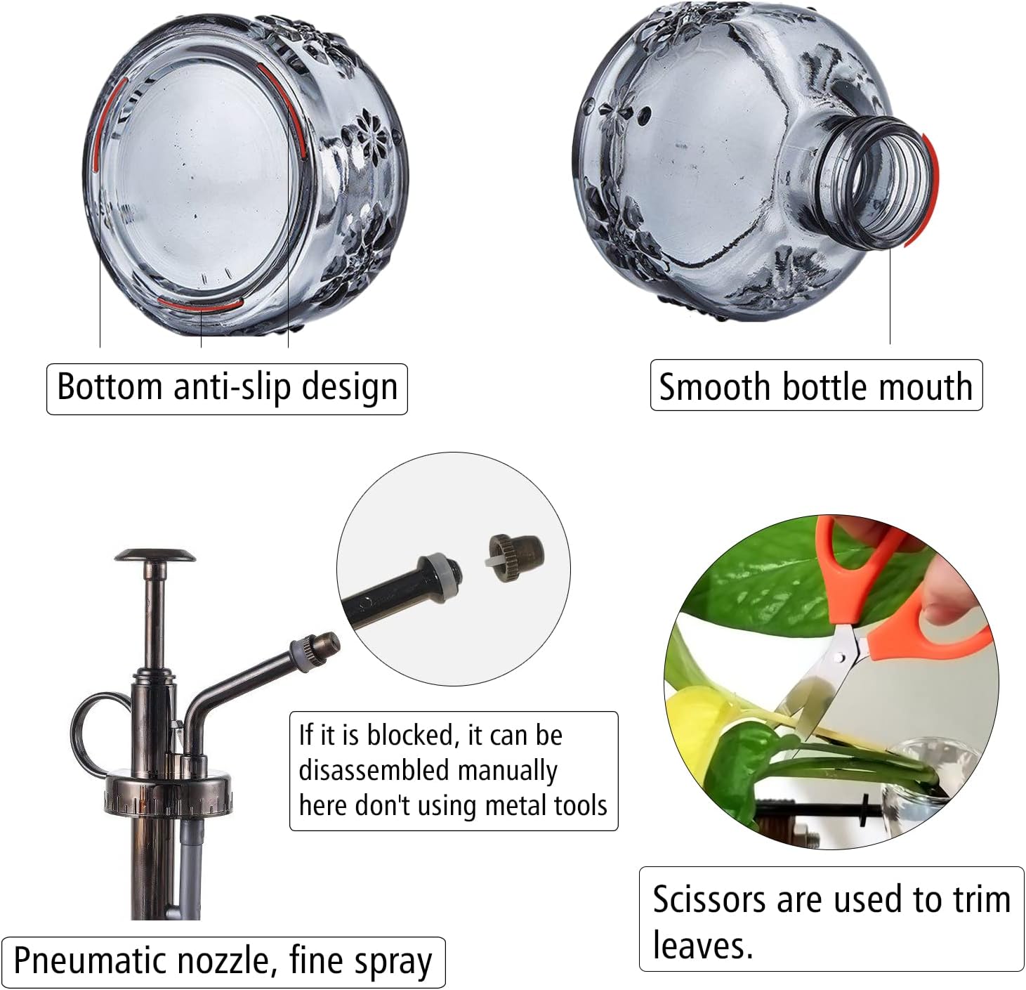 - Material: The bottle is made of high quality thick transparent glass, which is sturdy, durable and can’t easily break. The top pump is plastic with metallic paint which prevent rust and fading color. the pneumatic nozzle design of the plant atomizer creates a ultra fine mist