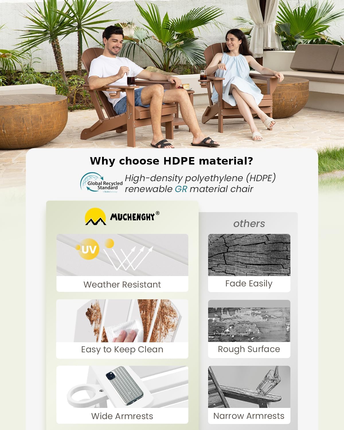 - Weather Resistant and Recyclable Material: The poly adirondack chair is made of weather resistant and UV-proof High Density Polyethylene composite material (HDPE), it will not crack, fade, peel and rot in any weather condition