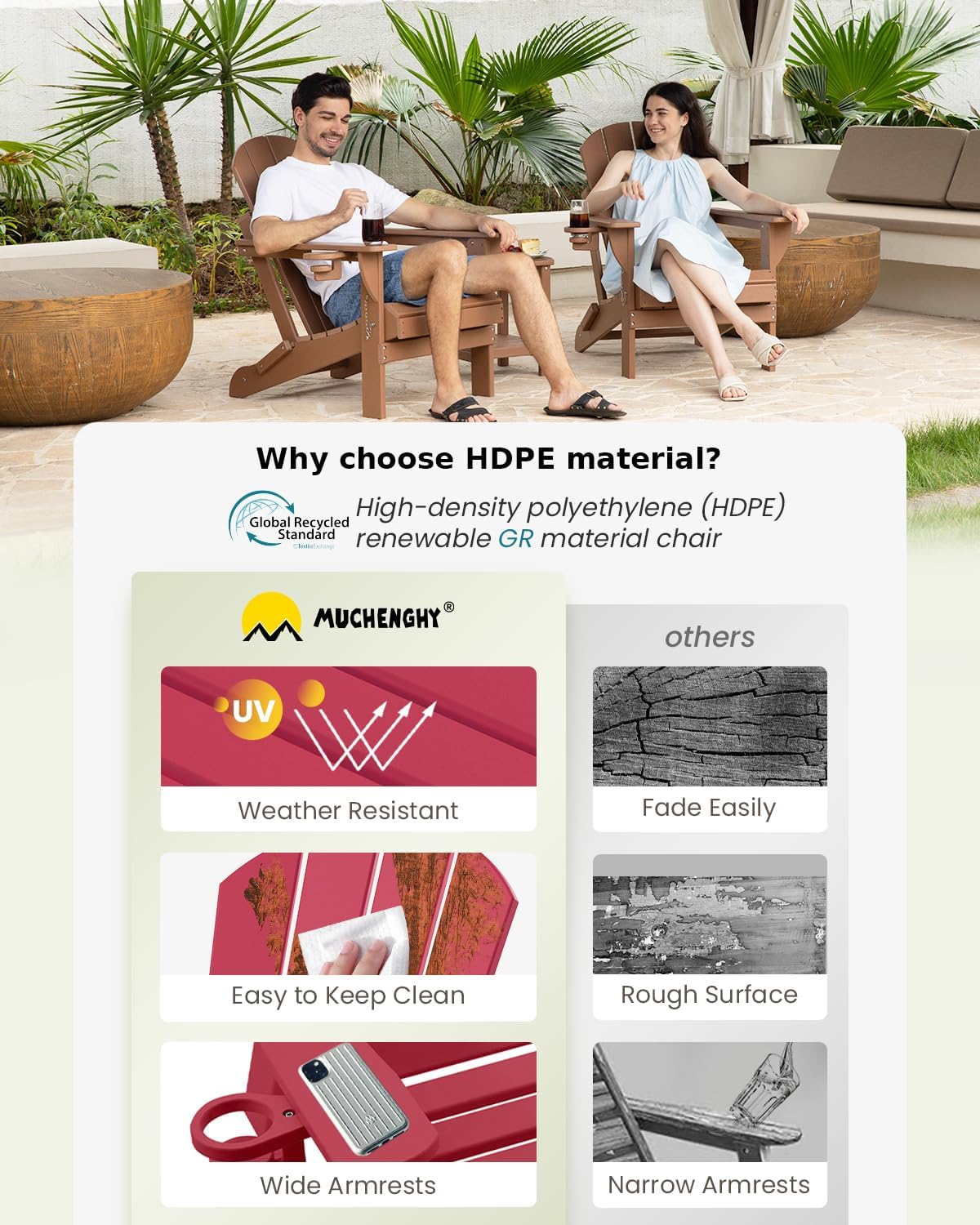 - Weather Resistant and Recyclable Material: The poly adirondack chair is made of weather resistant and UV-proof High Density Polyethylene composite material (HDPE), it will not crack, fade, peel and rot in any weather condition