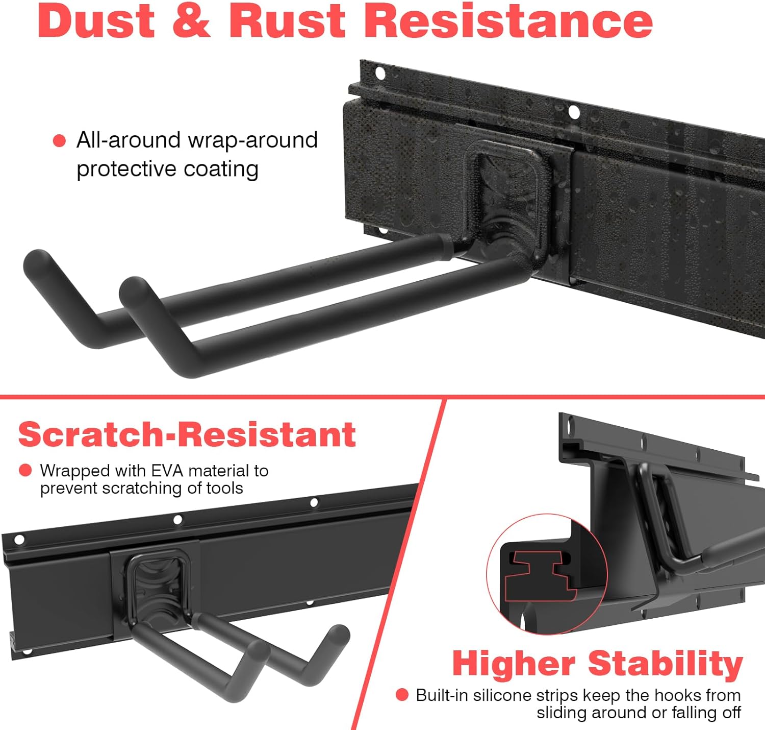 - Movable Garage Storage Hooks: When garage storage needs change, the fast wall-mount hooks can snap on the rail and move around on it to meet your actual needs. And It wonโt rust or chip over time