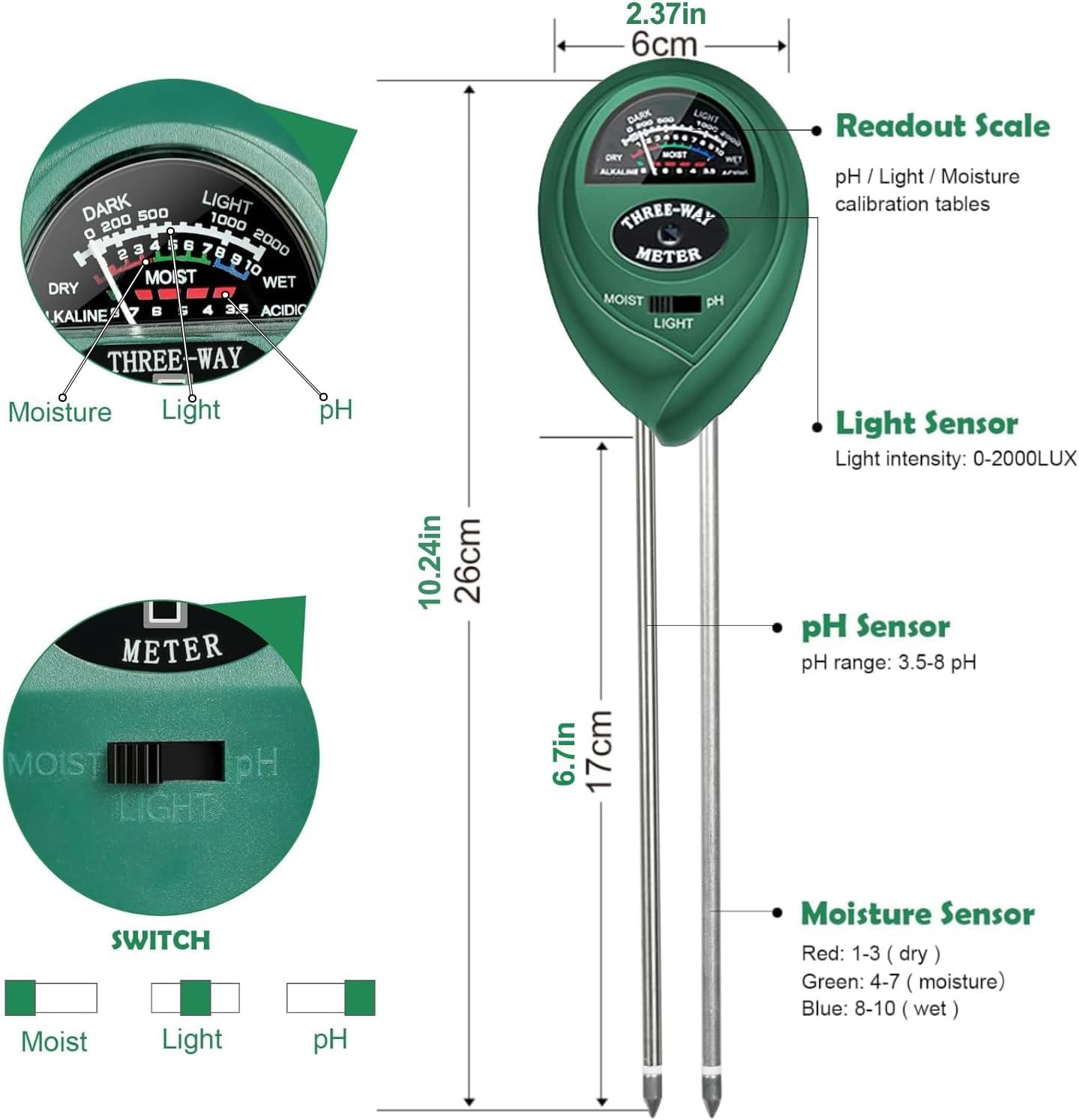 - INDOOR & OUTDOOR USE: Garden soil ph meter 3-in-1 soil tester is a super helpful tool for your gardening,it is extremely important for some delicate plants which are very sensitive to water,lights or PH.It's definitely a good tool soil moisture meter for your gardening