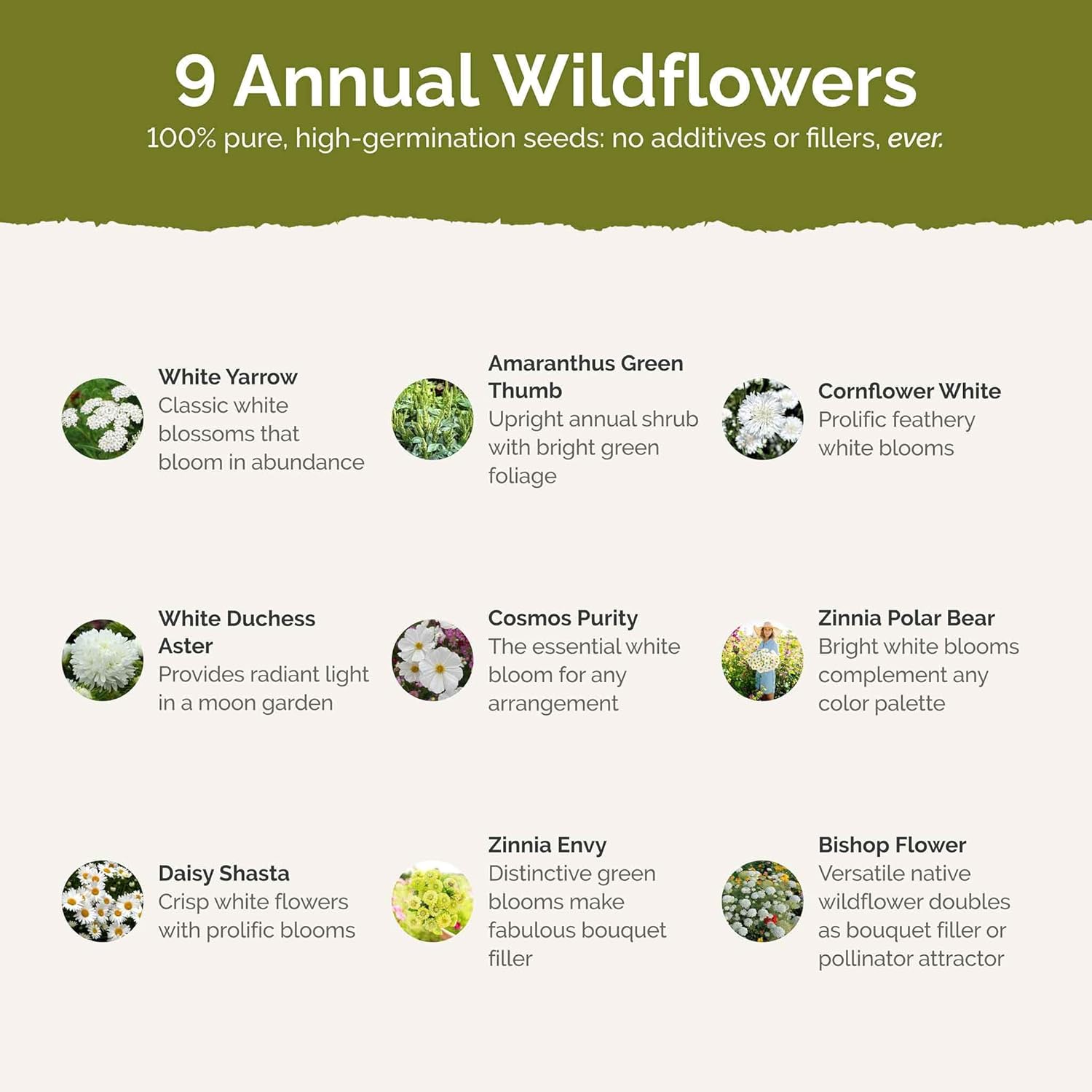 - 100% Pure, Non-GMO Seeds - No fillers, favorites only! Includes 9 easy-to-grow species: White Yarrow, Amaranthus Green Thumb, Cornflower White, White Duchess Aster, Cosmos Purity, Shasta Daisy, Zinnia Polar Bear, Zinnia Envy, Bishop Flower
